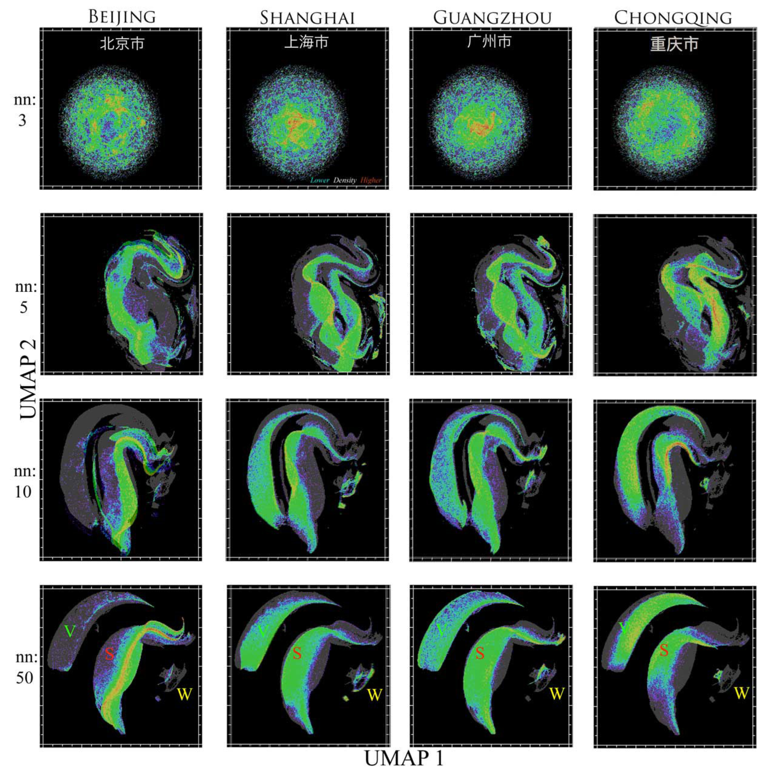 UMAP hyperparameter sweep for the EMIT quadcore mosaic segmented geographically for comparison of the four cities and their respective surrounding landscapes. Each density shaded subset of the embedding is superimposed on the silhouette (gray) of the 2D embedding of the full mosaic. These renderings of the spectral mixing space clearly show distinct, but overlapping, mixing continua for each city and its surrounding landscapes. The coalescence of distinct mixing continua between near_neighbor scales of 3 and 5 provides an indication, albeit qualitative, of the pervasive spectral mixing of water bodies, forests, agricultural landscapes and the built environments interspersed among them. Note the similarity of Shanghai and Guangzhou built/substrate continua (S) compared to very different topologies of the Beijing and Chongqing continua. In contrast, note the differences among the vegetation (V) continua and water (W) clusters for all four. Color density shading identical to previous figure.