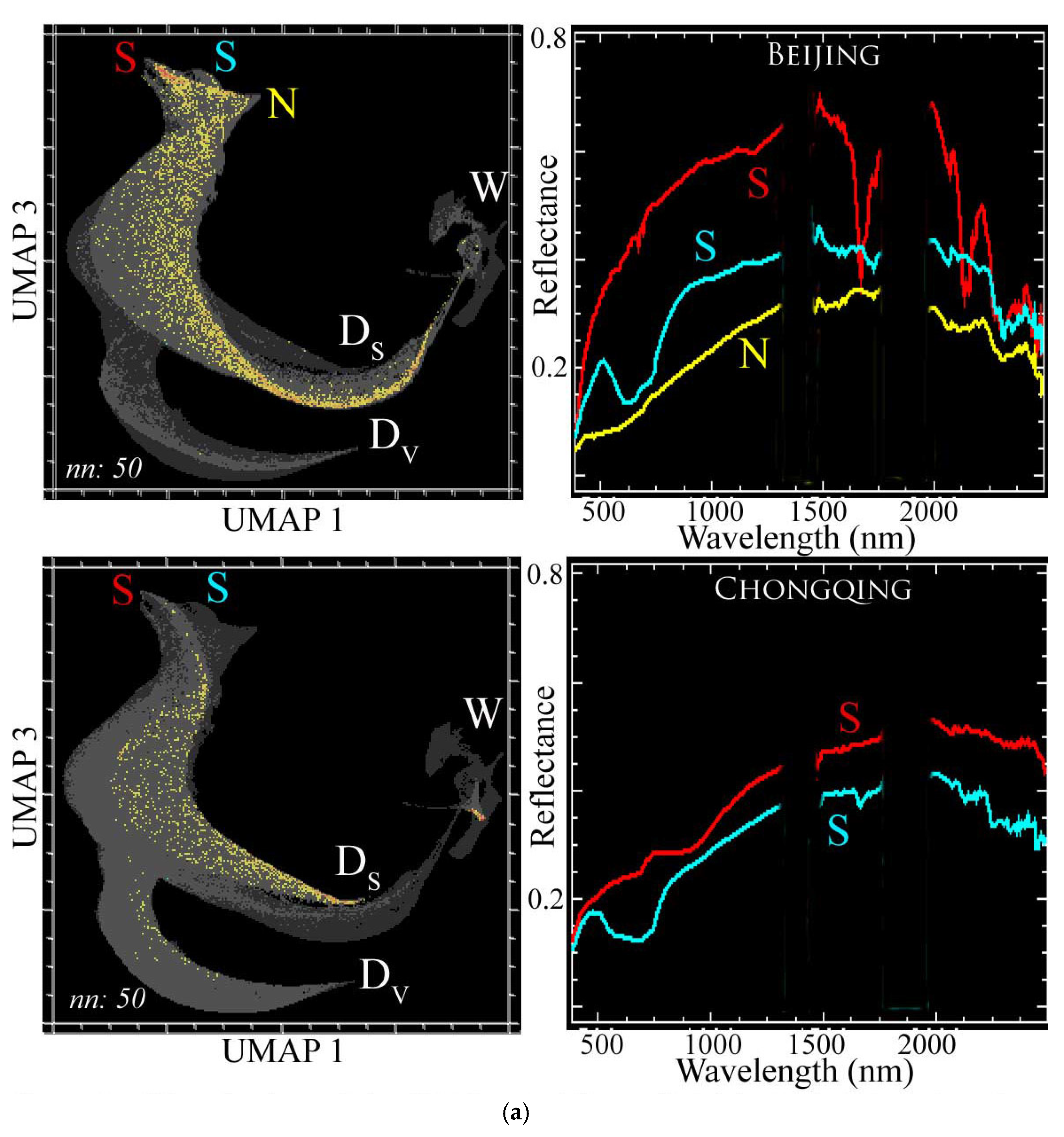 (a) Two-dimensional projections of 3D UMAP embeddings with high albedo Substrate endmembers for Beijing and Chongqing. Both projections (lighter) superimposed on the silhouette of the full quadcore mosaic (darker) for reference. The highest night light luminance pixels are superimposed in yellow. The brightest areas span the full range of the Substrate continuum in both cities but are most densely concentrated at the Substrate apex in Beijing. Airport runway cement endmember spectra (red) vary more than cyan roofing material (cyan) endmembers. The NPV endmember (N) is abundant only in the Beijing quadrant. (b) Two-dimensional projections of 3D UMAP embeddings with high albedo Substrate endmembers for Guangzhou and Shanghai. Both projections (lighter) superimposed on the silhouette of the full quadcore mosaic (darker) for reference. The highest night light luminance pixels are superimposed in yellow. Shanghai’s overglow brightness extends over the full range of all three mixing continua but is densest near the substrates apex. Airport runway cement endmember spectra (red) vary more than cyan roofing material (cyan) endmembers. Labels on UMAP embeddings correspond to locations of labeled spectra.