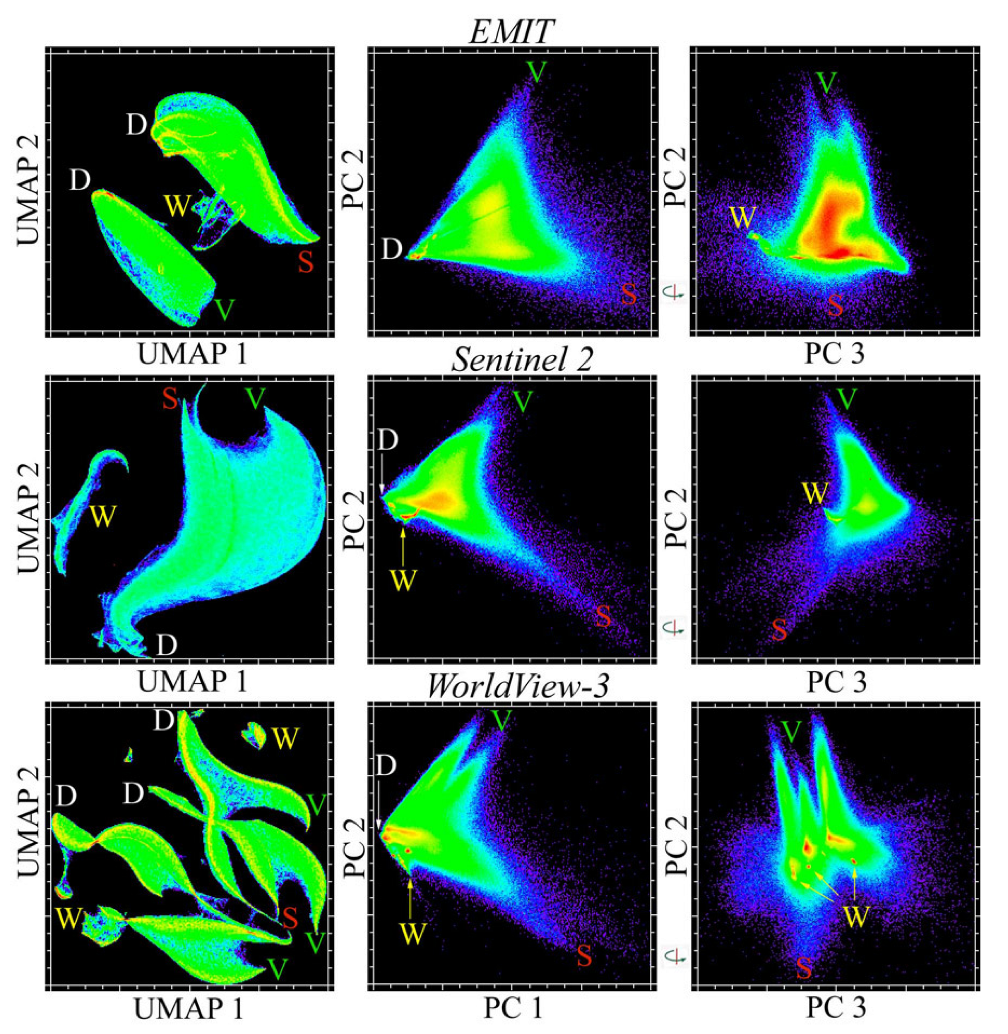 Complementary quadcore built environment spectral mixing spaces for hyperspectral and multispectral sensors spanning 1 to 2+ orders of magnitude spectral and spatial resolution. The ternary SVD mixing continuum is pervasive, despite multiple distinct water body reflectances forming additional clusters and spurs from the D EM. The segregated WorldView-3 mixing space results from different calibrations and atmospheric effects which are corrected in the EMIT and Sentinel-2 products. S, V, D, W labels correspond to usage in previous figures.