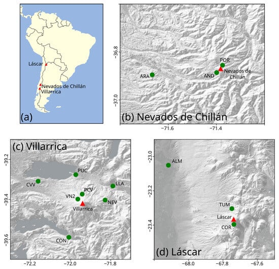 Geographic position of the studied volcanoes in South America (panel (a)) and visible cameras (panels (b–d)) considered in this work (see Figure 2). Red triangles indicate volcanic vents, and green circles represent the positions of visible cameras.