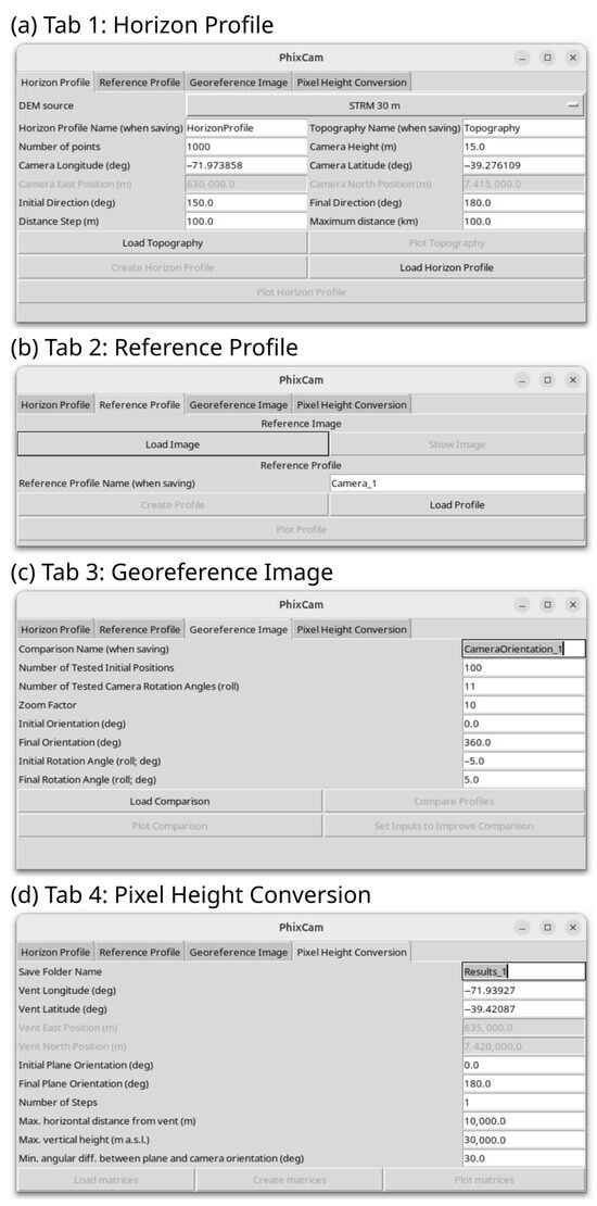 PhixCam (Figure 3 and Table 2) is a software that allows the user to analyze DEMs in order to characterize the volcano topography observed from a given position and compare it with images captured by visible cameras, allowing their georeferentiation, including tilt and roll rotation (Figure 4a). The software also allows estimation of the height associated with each pixel of the images when different emission directions of volcanic products are considered. Please note that PhixCam is not intended to be used in real time but applied after significant changes in camera orientation (e.g., due to maintenance tasks) to calibrate this device and obtain a set of operative matrices that will allow to interpret the position of each pixel of the images in terms of elevation above sea level. PhixCam includes four modules, each one hosted in a different tab (Figure 3):