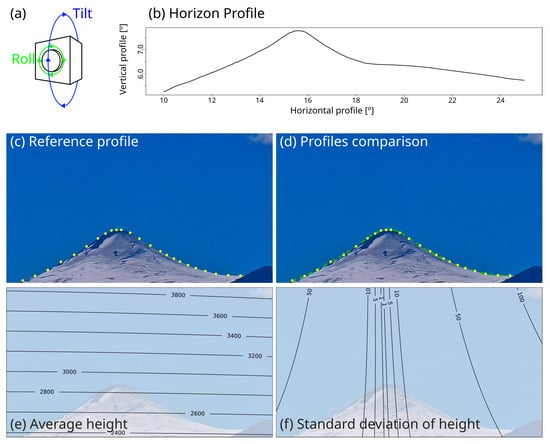 (a) Scheme of the tilt and roll rotation directions of a camera. (b) Example of a horizon profile computed by PhixCam (yellow dots). (c) Example of a reference profile traced in PhixCam (green dashed line). (d) Fit between the reference and horizon profiles (see Table 3). (e,f) Illustrative examples of the results produced by PhixCam, including the average height of each pixel for a range of directions of emission of volcanic products (N60E to N120E; panel (e)) and the associated standard deviation (panel (f)). All the example images presented here are associated with the camera CON of Villarrica volcano.