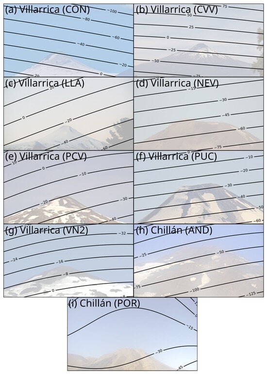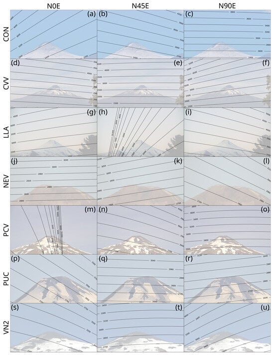In order to highlight the critical influence of wind direction in video monitoring of eruption parameters, Figure 6 presents the isolines of height above sea level for the studied instruments of Villarrica volcano, considering different planes of propagation of pyroclastic material: N-S (left-hand panels), NE-SW (center panels) and W-E (right-hand panels). As can be inferred from Figure 6, the effect of wind field in height isolines is able to generate significant differences in the estimates of column height. Propagation of volcanic products almost parallel to the observation direction significantly reduces the applicability of surveillance cameras in volcano monitoring, as is observed under specific wind conditions for LLA (Figure 6h) and PCV (Figure 6m) cameras of Villarrica volcano, stressing the critical need to install and integrate surveillance cameras on different flanks of volcanoes considering the orientation of dominant winds. The critical effect of wind is also observed in Figure 7, where we present the record of a low-intensity event that occurred on 21 July 2024 at Villarrica volcano (17:53 local time, visible camera PCV; Figure 7a–h). We present the comparison between height estimates derived from the application of a PhixCam-based calibration (Figure 7i,j, considering winds blowing in the range N300E–N330E) and a calibration based on regularly spaced horizontal isolines, which is the approach currently adopted by Sernageomin. Results show comparable heights in the vicinity of the vent, while a clear and increasing bias in height estimates emerges when the plume approaches the margins of the image, with a height difference above the crater of more than . These discrepancies may induce significant differences in any derived estimate of volcanological interest, such as the mass eruption rate [,].