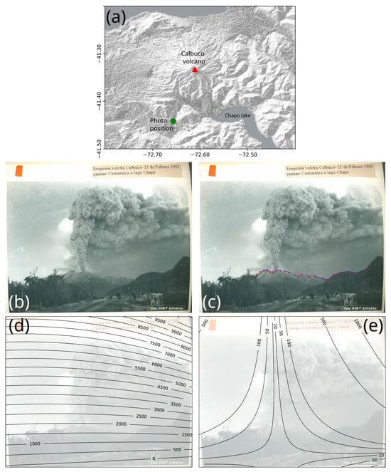 Application of PhixCam to the analysis of the historical archive: (a) Shaded relief map of Calbuco volcano, with indications of the position from which we interpret the picture presented in panel b was taken. (b) Photo of the Calbuco volcano eruption of 21 February 1961 []. This photo is part of the Chilean National archive and is labeled with the following text: “Calbuco volcano eruption, 21 February 1961. Correntoso route to Chapo lake”. (c) Comparison of topography traced in the image (red markers) and the observed relief from the position from which, according to our results, this photo was taken (blue, dashed line). Results indicate that the image presents a roll rotation of 2.36° (anticlockwise). (d) Average height of each pixel of the image when volcanic products are assumed to have been emitted from the active vent towards the east (between N70E and N110E), while the standard deviation is presented in panel (e).