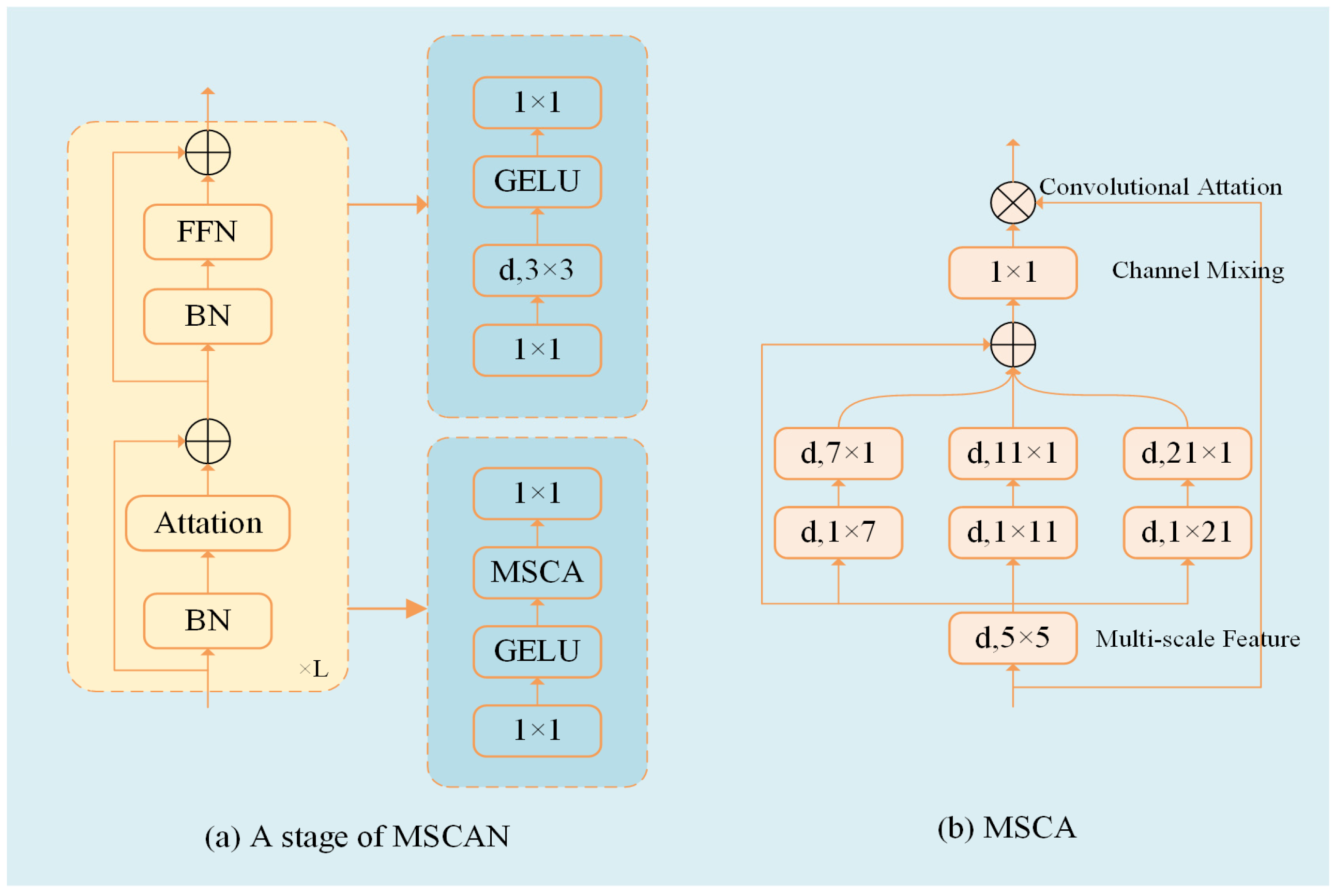 - Guo, M.-H.; Lu, C.-Z.; Hou, Q.; Liu, Z.; Cheng, M.-M.; Hu, S.-M. SegNeXt: Rethinking Convolutional Attention Design for Semantic Segmentation. arXiv 2022, arXiv:2209.08575. [Google Scholar]