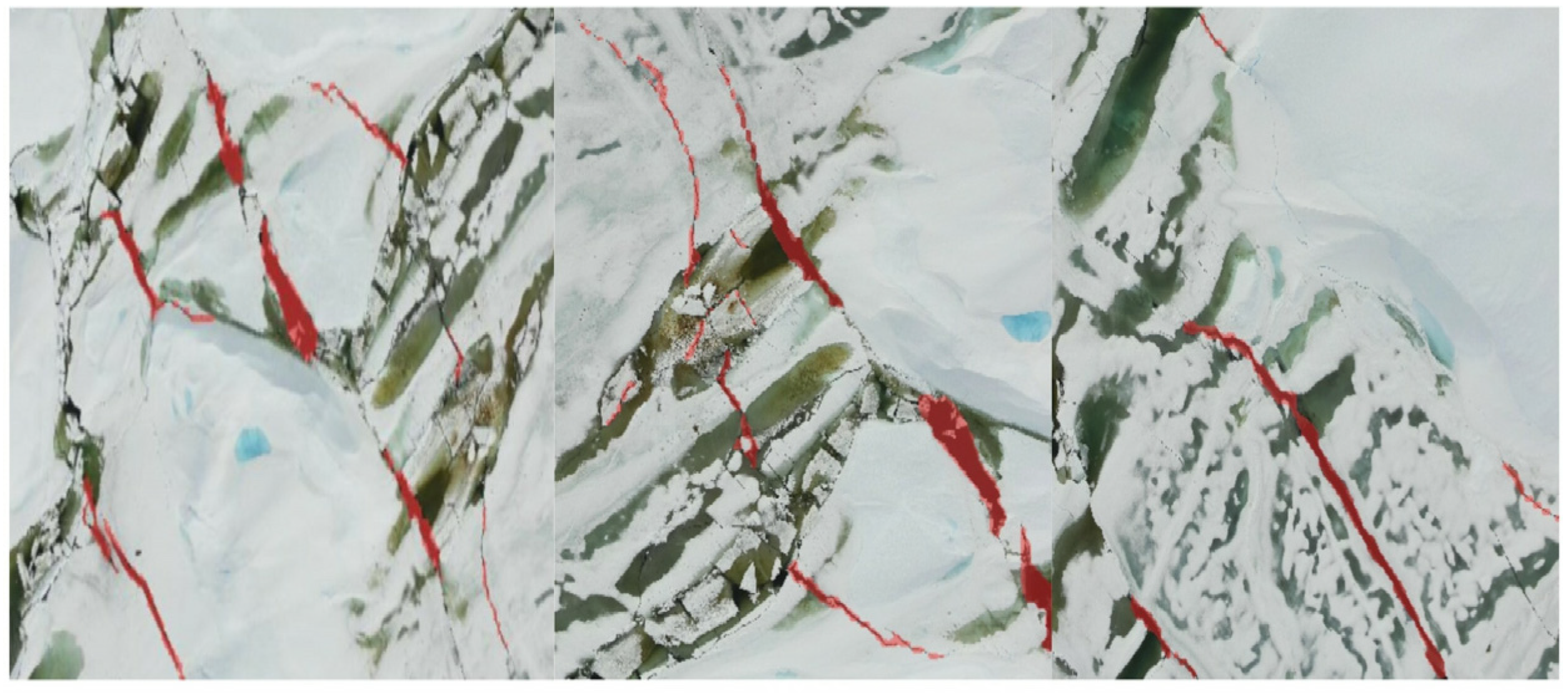- The spatial distribution of ice cracks is distinct. Short ice cracks are primarily distributed in a curved and concentrated manner around areas where broken ice meets water bodies, as well as around the peripheries of icebergs or regions with significant sea ice height changes. In contrast, long ice cracks are primarily distributed in straight lines and rarely intersect.