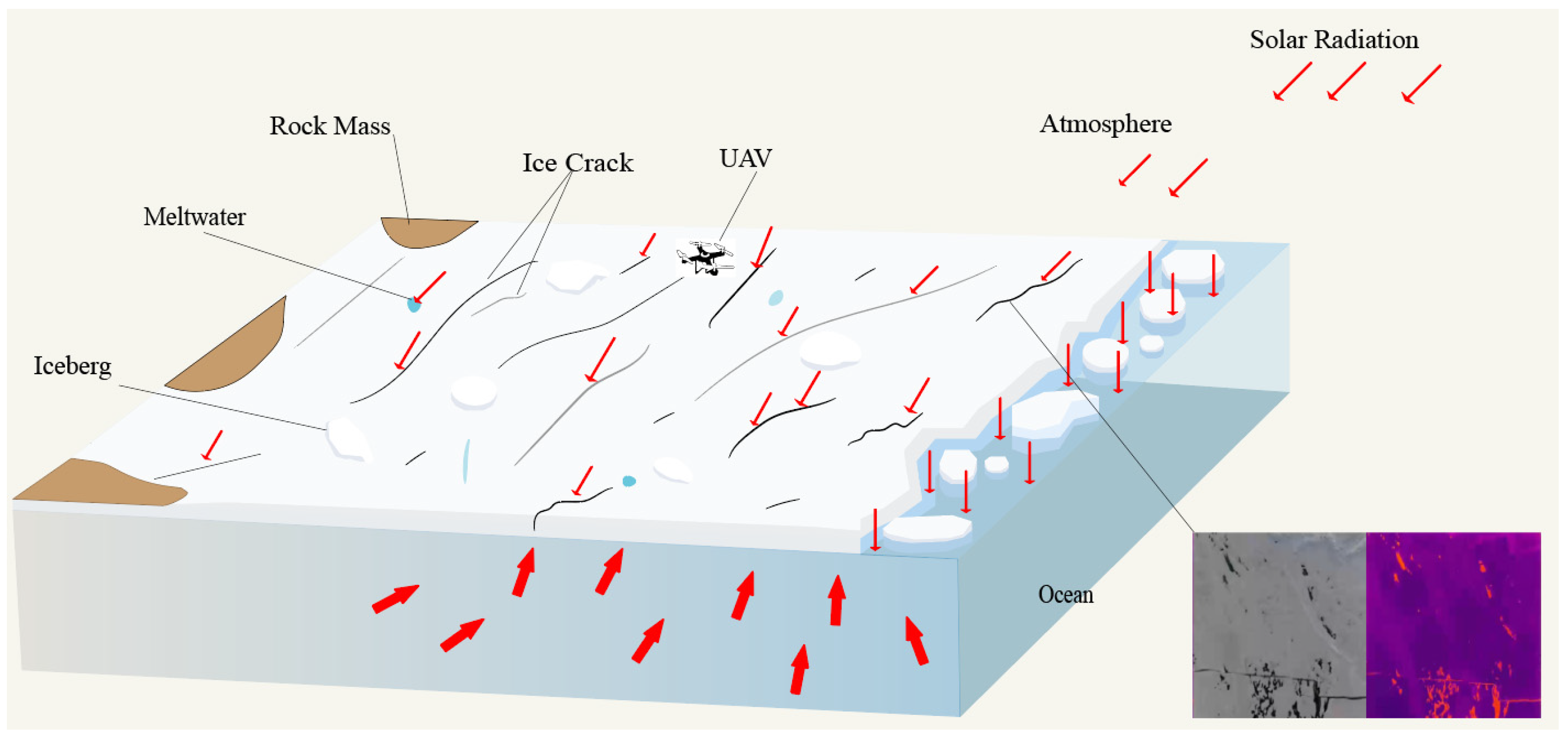 - Ice cracks affect sea ice heat flux and stability. In the Antarctic summer, high heat flux in ice crack and dark sea ice areas accelerates melting and reduces sea ice stability, indicating that ice cracks play a significant role in sea ice dynamics and climate change.