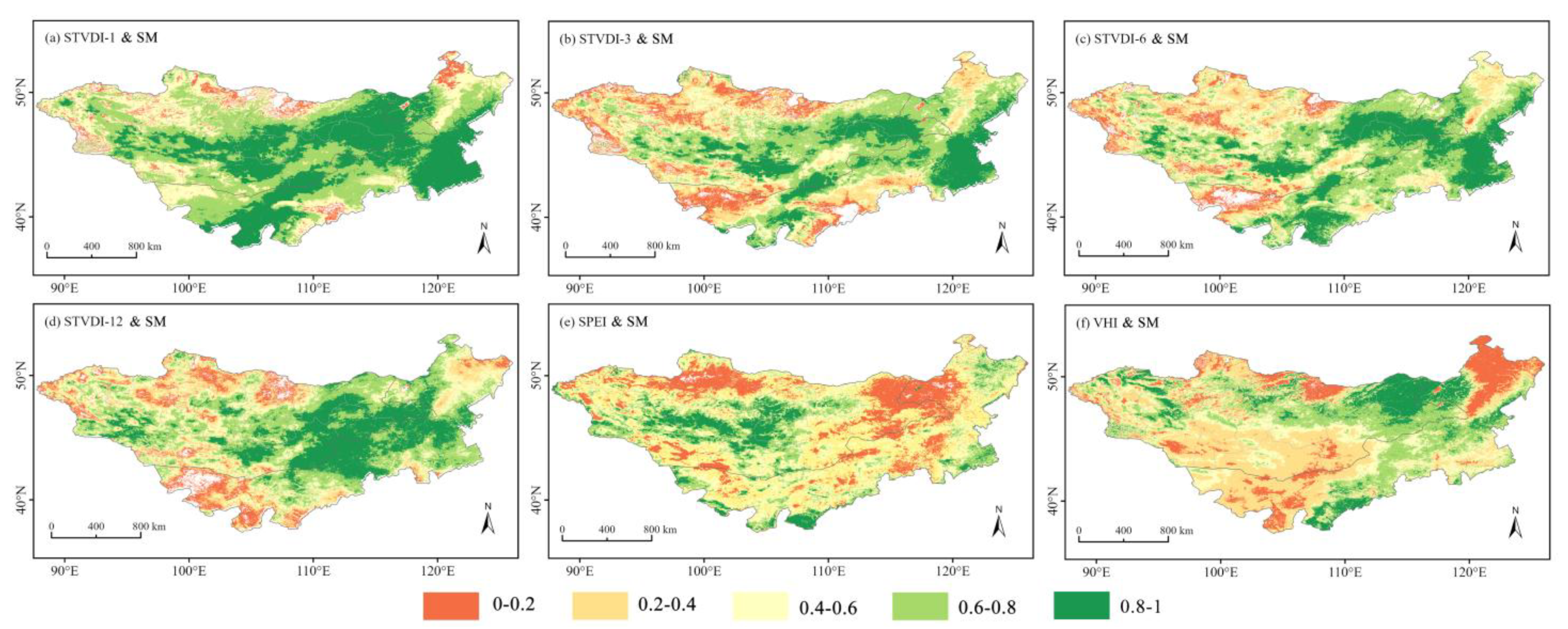 S D is the standard deviation, x ¯ and y ¯ represent the means of x and y , respectively. In this study, a positive lag k > 0, indicates that STVDI responds after precipitation or soil moisture, while a negative lag k < 0, suggests that STVDI leads these variables. A lag of zero implies that the two variables change in synchrony. To capture the short-term memory of precipitation and soil moisture on drought evolution, we applied a ±3-month lag window, which corresponds to the typical seasonal response time of soil moisture and vegetation growth in semi-arid ecosystems such as the Mongolian Plateau. For this study, x was STVDI and y represented precipitation or SM.
