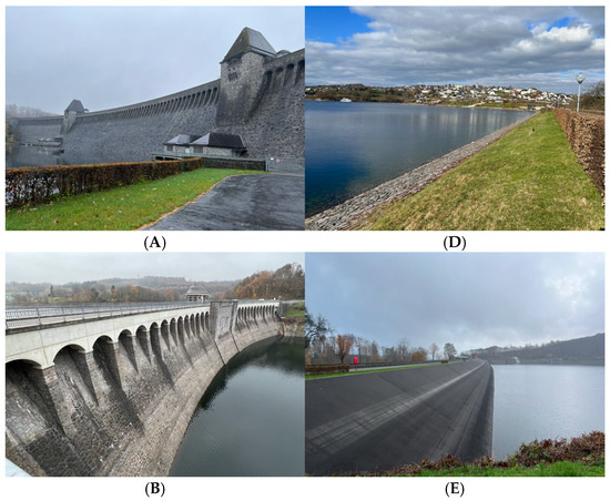 Photos of the six dams included in this study: gravity dams (A) Möhne, (B) Lister, (C) Fürwigge; embankment dams (D) Sorpe, (E) Bigge, (F) Verse.