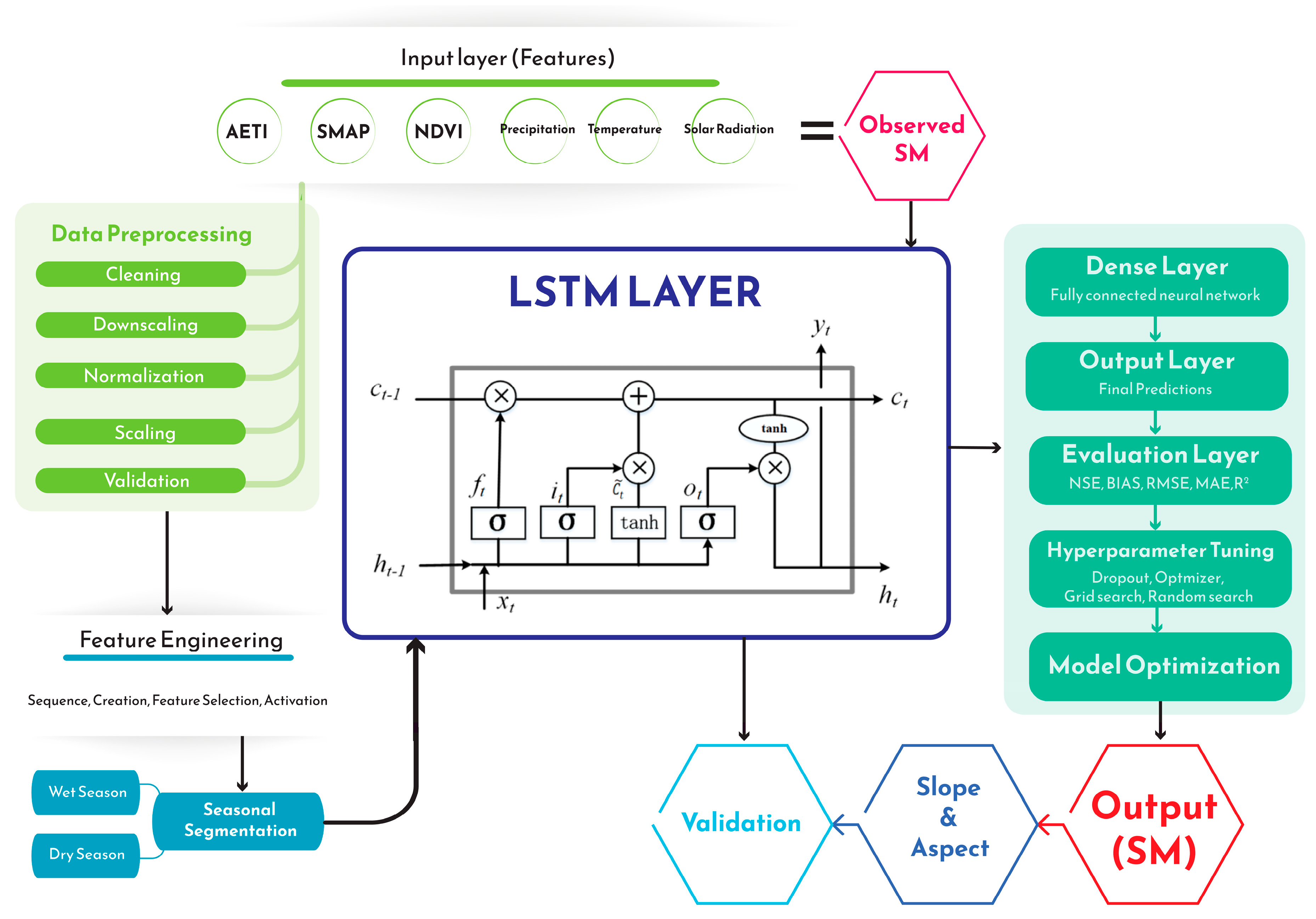 Figure 2. Overview of the soil moisture prediction model using an LSTM neural network. The diagram illustrates the data preprocessing, feature engineering, LSTM architecture, and model evaluation steps, integrating environmental variables for soil moisture estimation.