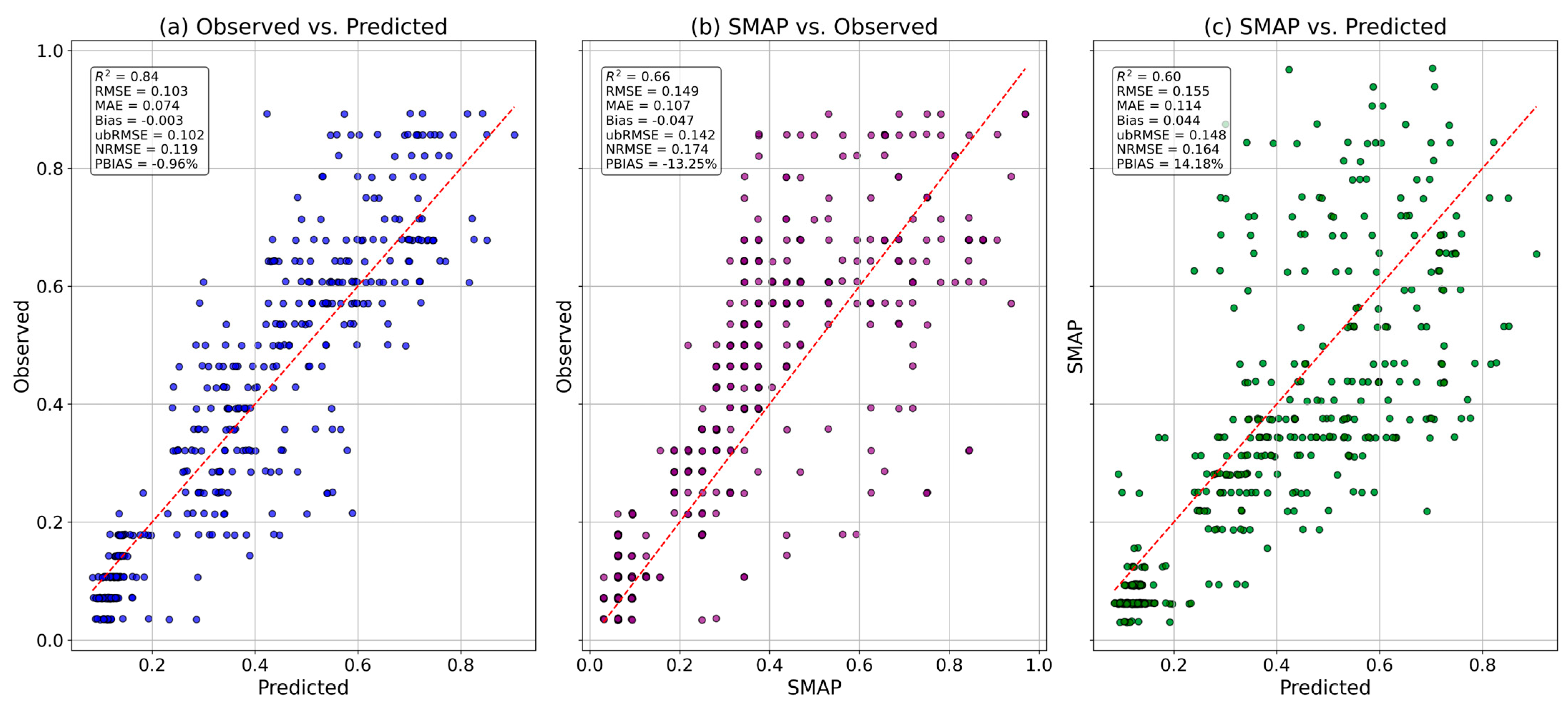 Figure 4. Comparison of predicted, SMAP, and observed soil moisture values with performance metrics from three perspectives: (a) observed versus LSTM-predicted values, (b) SMAP-derived versus observed values, and (c) SMAP-derived versus LSTM-predicted values. The dashed red line in all plots represents the 1:1 line.