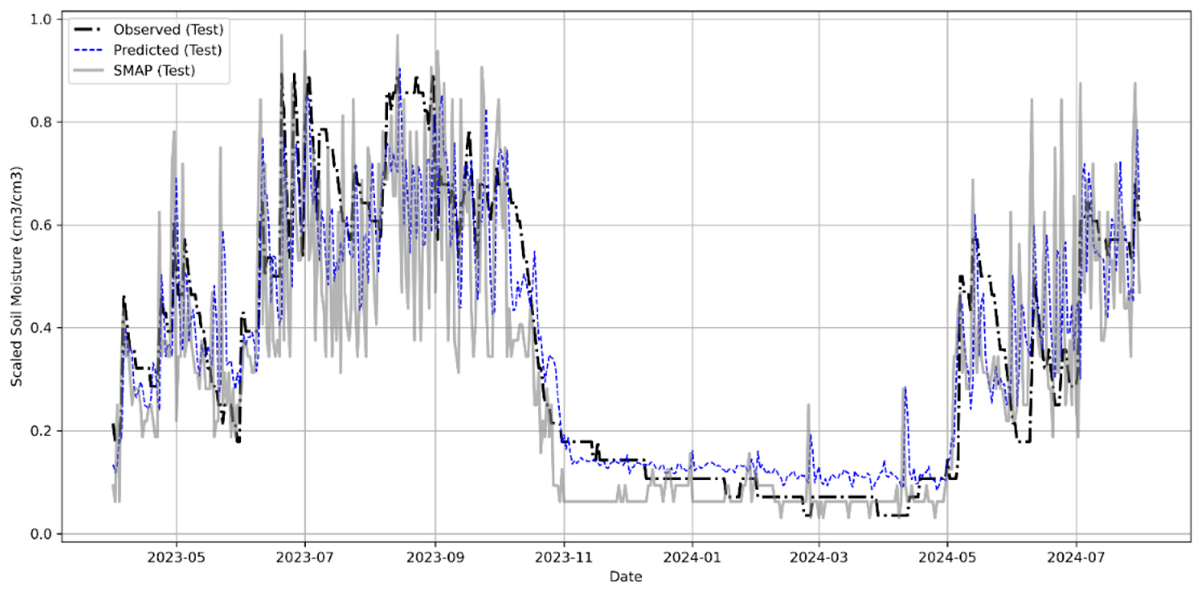 Figure 5. Daily temporal dynamics of observed, predicted, and SMAP-derived soil moisture over the test period (February 2023–July 2024).