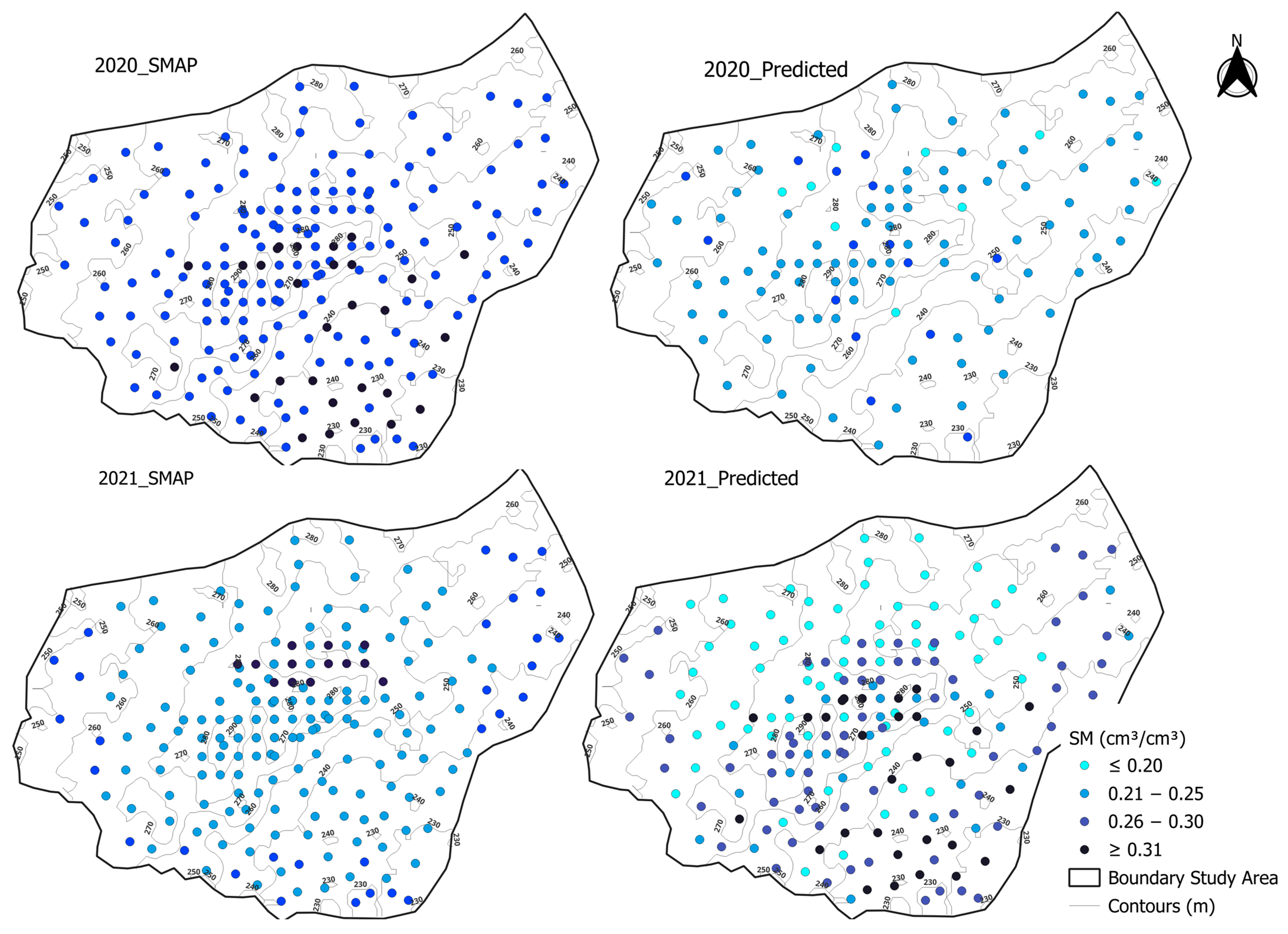 Figure 6. Spatial distributions of the predicted soil moisture and SMAP satellite-derived soil moisture from 2020–2023.