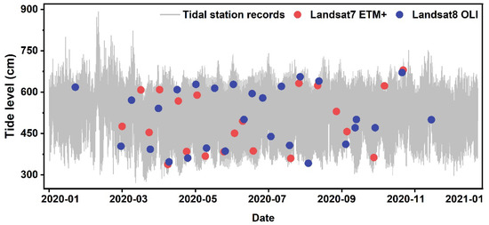 Tidal flats are primarily distributed in the coastal zone between high and low tide levels and exhibit pronounced temporal variability under the influence of tides [13,14]. However, since Landsat satellite observations are limited to almost fixed overpass times [15], it is difficult to ensure that the satellite overpass times coincide precisely with either the highest or lowest tide levels (as illustrated in Figure 1). To address this limitation, current tidal flat mapping approaches typically adopt a multi-temporal strategy to increase the probability of capturing both high and low tide levels [16,17,18]. From a probabilistic perspective, a higher frequency of satellite observations enhances the chances of capturing extreme tidal conditions. Nevertheless, the spatial and temporal distribution of Landsat observations is inherently non-uniform [19]. The Landsat satellite observation frequency has increased significantly over time due to the continued operation and launch of successive Landsat missions [20]. Recent studies have shown that the number of Landsat observations available in 2020 is twice that of 2000 [21]. Consequently, when analyzing long-term changes in tidal flat extent using Landsat-based products, it is essential to account for the influence of observation frequency on the mapped tidal flat area.