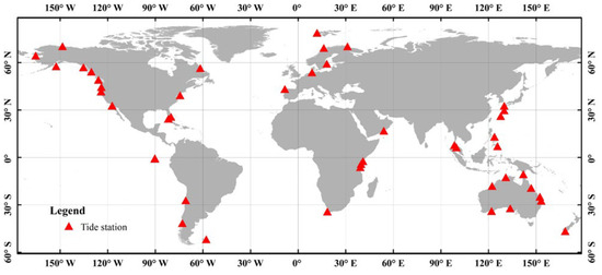The UHSLC tide level dataset (https://www.ncei.noaa.gov/access/metadata/landing-page/bin/iso?id=gov.noaa.nodc:JIMAR-JASL, accessed on 20 August 2024), provided by the University of Hawaii Sea Level Center, is a key component of the Global Sea Level Observing System (GLOSS) data stream. While the dataset comprises a wide array of tide gauge records, its core is the GLOSS Core Network (GCN), which consists of approximately 300 tide gauge stations strategically distributed around the globe. This network is designed to offer broad spatial coverage and to ensure an even sampling of coastal sea level variations across diverse regions and timeframes, thereby facilitating comprehensive assessments of both long-term and regional sea level trends. The UHSLC provides tide gauge data with two levels of quality control: Fast Delivery (FD) data, which enables rapid access, and Research Quality Data (RQD), which undergoes more extensive filtering and validation to achieve higher accuracy, albeit with a longer processing time. For the purposes of this study, the more accurate RQD dataset was selected. A total of 147 tide gauge stations were included, with data spanning the years 2000 to 2022. Each station provides measurements at a 1 h temporal resolution, offering detailed temporal information for analyzing tide level fluctuations and changes over the selected period.