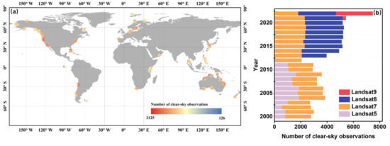 The spatiotemporal distribution of available Landsat observations at the tide gauge stations. (a) Spatial distribution of the total number of clear-sky Landsat observations at each tide gauge station from 2000 to 2022. (b) Temporal trend of the total number of clear-sky Landsat observations across all tide gauge stations from 2000 to 2022.