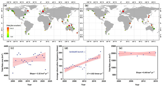 The number of Landsat observations has increased steadily over time [22]. This higher observation frequency enhances the likelihood of capturing both the highest and lowest tide levels, thereby enabling the detection of larger tidal flat areas. However, excessively dense observations may also lead to an inflation in the long-term tidal flat remote sensing dataset [23], which may cause a spurious increase in mapped tidal flat extent. For instance, Murray et al. [6] mapped the global distribution of tidal flats from 1984 to 2016 and reported that approximately 16.02% of tidal flat loss occurred within only 17.1% of the mapped global tidal flat regions—those with sufficient data to support a consistent multi-decadal time series. In contrast, our statistical analysis of their publicly available dataset reveals an overall increasing trend in global tidal flat area over the past 30 years (as shown in Figure 2), which contradicts their conclusion. This discrepancy between remote sensing-derived statistics and the tidal flat change trends reported may be attributed to the influence of Landsat observation frequency on long-term tidal flat monitoring. Therefore, it is essential to investigate whether the observed increase in tidal flat area reflects a genuine environmental trend or an artifact driven by variations in Landsat observation frequency.
