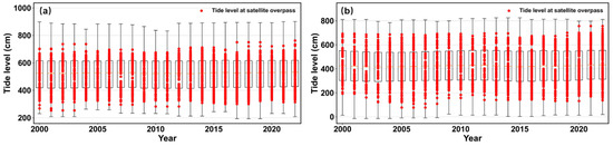Distribution of tide levels at satellite overpass relative to observed tide levels at typical tide gauge stations from 2000 to 2022. Station (a): Cuxhaven station; Station (b): Darwin station.