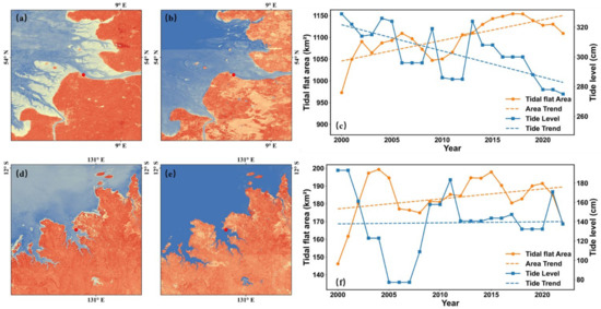Figure 8 presents satellite-derived imagery capturing the lowest and highest tide levels at two representative tide stations in 2020, along with the temporal trends in both the observed lowest tide levels at satellite overpass times and the corresponding tidal flat areas within a 1° buffer around each station. It is evident that satellites detect a much broader extent of tidal flats during low tide conditions (Figure 8a,d), while during high tide, the detectable extent becomes markedly smaller (Figure 8b,e). This spatial contrast highlights the substantial influence of tidal variation on the observable geomorphic extent of tidal flats, particularly in regions experiencing greater tide amplitude. Furthermore, the analysis of temporal trends (Figure 8c,f) reveals a strong association between the mapped tidal flat area and the lowest tide levels at the time of satellite overpass. Specifically, an increase in the observed tidal flat area corresponds with a decreasing trend in the lowest tide levels, and stations experiencing greater reductions in tide level tend to show more substantial increases in mapped tidal flat areas. These findings emphasize the critical link between tidal conditions and the spatiotemporal variability of satellite-derived tidal flat extents.