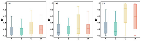 Distribution of R2 values from regression models relating observation frequency, tide level, and tidal flat area for two global tidal flat products across different time periods. (a) R2 distributions for 2000–2022. (b) R2 distributions for 2000–2012 (before the launch of Landsat 8). (c) R2 distributions for 2013–2022 (after the launch of Landsat 8). A: GTF30, observation frequency vs. tide level; B: GTF30, tide level vs. tidal flat area; C: Murray, observation frequency vs. tide level; D: Murray, tide level vs. tidal flat area.