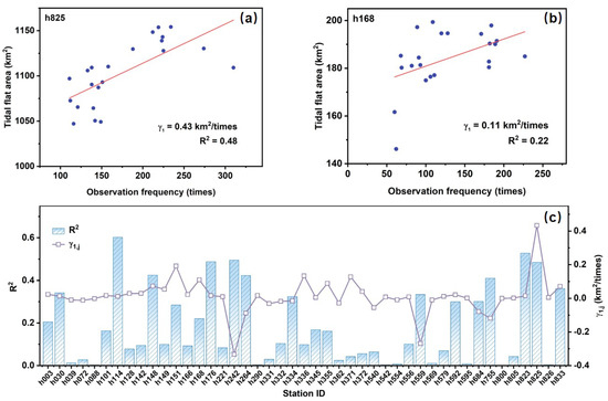 There is a close relationship between the frequency of satellite observations, the tide levels at the time of satellite overpass, and the area of tidal flats monitored by satellites. Specifically, an increase in satellite observation frequency enhances the likelihood of capturing lower tide levels, which in turn increases the probability of observing larger tidal flat areas. This suggests that higher observation frequency may indirectly contribute to a more comprehensive mapping of tidal flats. To quantitatively assess the driving effect of observation frequency on the mapped tidal flat area, this study employs linear regression models at each selected tide station. Three regression analyses were conducted: (1) between satellite observation frequency and tide level at overpass time, (2) between tide level and the monitored tidal flat area, and (3) between satellite observation frequency and the mapped tidal flat area. These models aim to evaluate the influence of satellite observation frequency on tidal flat measurements across varying tide regimes.