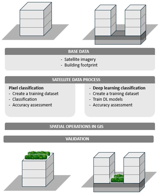 The imagery-based proposed methodology comprises two approaches for mapping GR, depending on their locations (rooftop or ground-level): GR at a rooftop level generally corresponds to a single building; GR at a ground level generally corresponds to green spaces that cover underground infrastructures, as garages shared by several buildings. These two situations are illustrated in Figure 1.