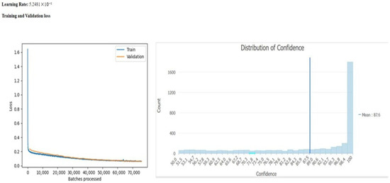 The Residual Neural Network (ResNet) addresses problems with convergence when the training initially converges and then saturates, degrading rapidly, as described in [29], by means of introducing a deep residual learning framework. In this framework, residual functions are learned with reference to the layer inputs, instead of being learned as unreferenced functions. In terms of model specificity, a backbone of a resnet50 and a learning rate of 5.2481 × 10−5 were used. Moreover, as shown in Figure 8, the training process is converging. Regarding the average precision score, class A has a precision of 0.92 and class B 0.93.