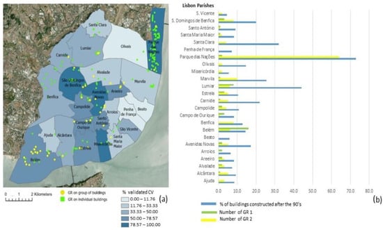 (a) Distribution of green roofs (GR1 and GR2) and the percentage of validated CV by per parish; (b) number of GR1 and GR2 mapped per parish and the percentage of new building construction by parish.