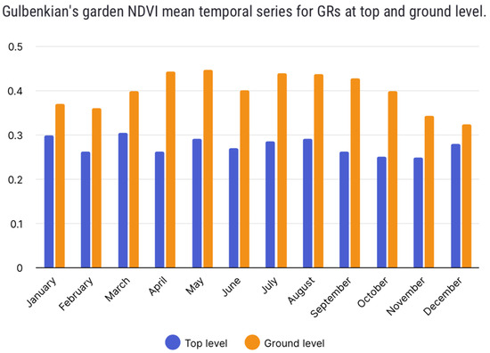 For GRs at the top level, the highest mean NDVI was observed in March, reaching a value of 0.31. Conversely, for GRs at ground level, May exhibited the highest NDVI mean at a value of 0.49. On the contrasting end of the spectrum, the months of November and December recorded the lowest NDVI means for GRs at the top (0.25) and ground level (0.32), respectively (Figure 12).