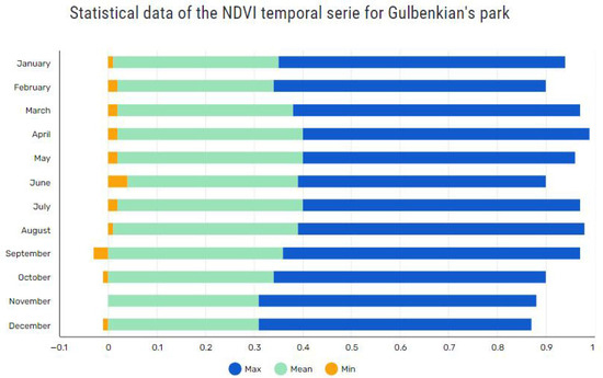 Considering the footprint of Gulbenkian’s GRs (delivered by the Gulbenkian office, represented in black in Figure 11), the NDVI image was cropped and a temporal series of NDVI images, from January to December, have been built. In the subsequent phase of the analysis, statistical metrics were computed for each month, providing a comprehensive understanding of the temporal variations in greenness. The calculated statistics encompassed the mean, maximum, and minimum values of the NDVI for all the polygons that represent the GR boundaries (Figure 13).