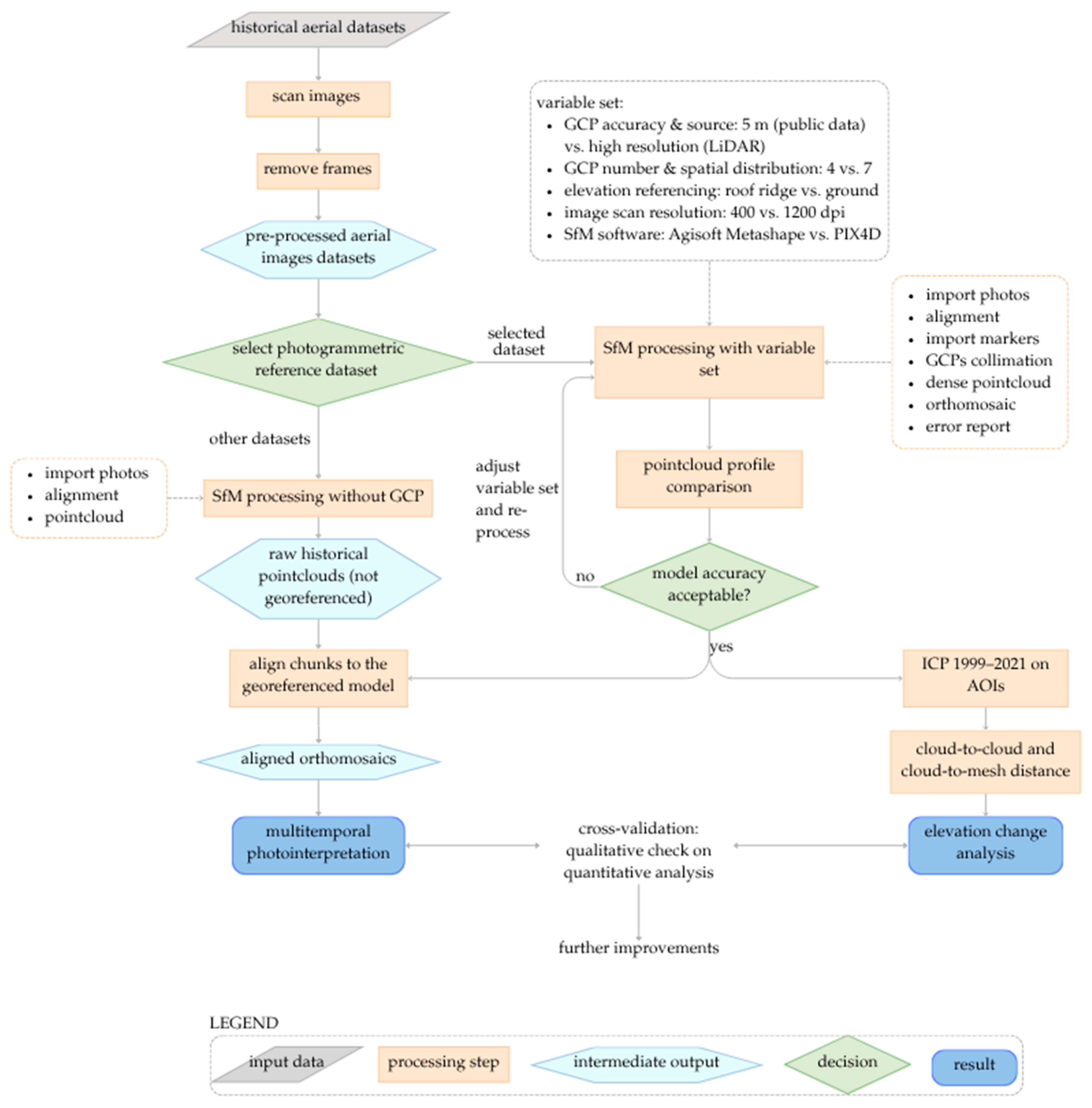 In this study, an iterative workflow (Figure 1) was implemented to test different processing approaches and identify the optimal combination of variables for handling the historical aerial image dataset. The workflow was designed with a dual objective: (i) to generate a point cloud forming the basis of a 3D model for multi-temporal analysis, specifically through point cloud differencing over selected sub-areas; (ii) to produce orthomosaics for visual and multi-temporal comparison, and photointerpretation across the entire catchment.