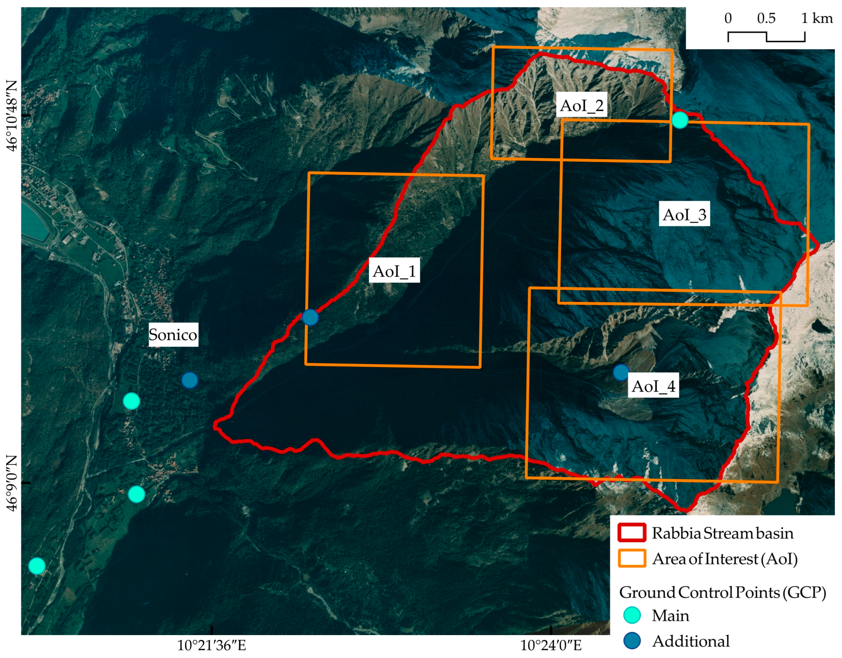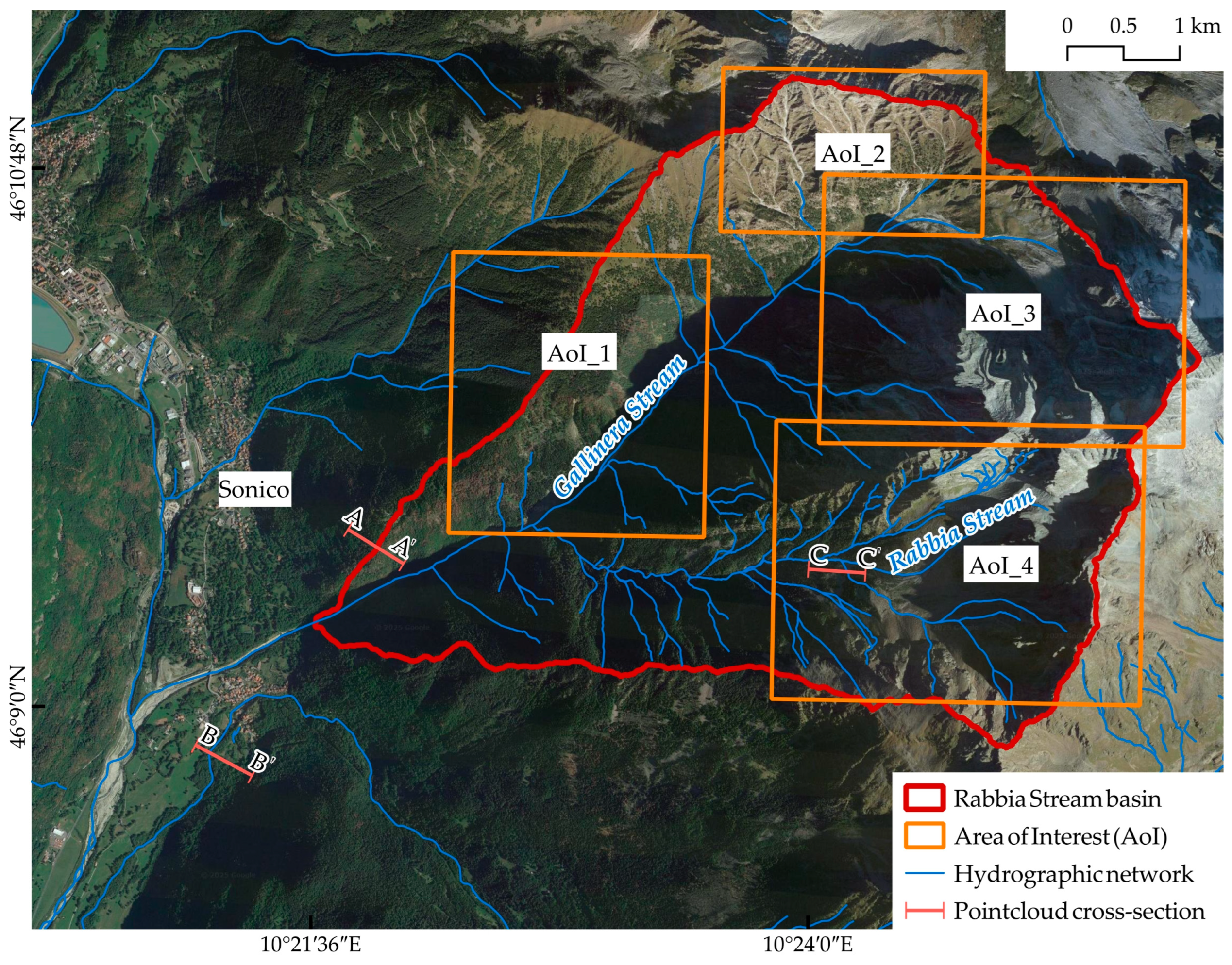 Voglino, B.; Godone, D.; Baldo, M.; Bono, B.; Luino, F.; Bonomelli, R.; Colosio, P.; Beretta, L.; Albertelli, L.; Turconi, L. Application of Structure from Motion Techniques Using Historical Aerial Images, Orthomosaics, and Aerial LiDAR Point Cloud Datasets for the Investigation of Debris Flow Source Areas. Remote Sens. 2025, 17, 3658. https://doi.org/10.3390/rs17223658