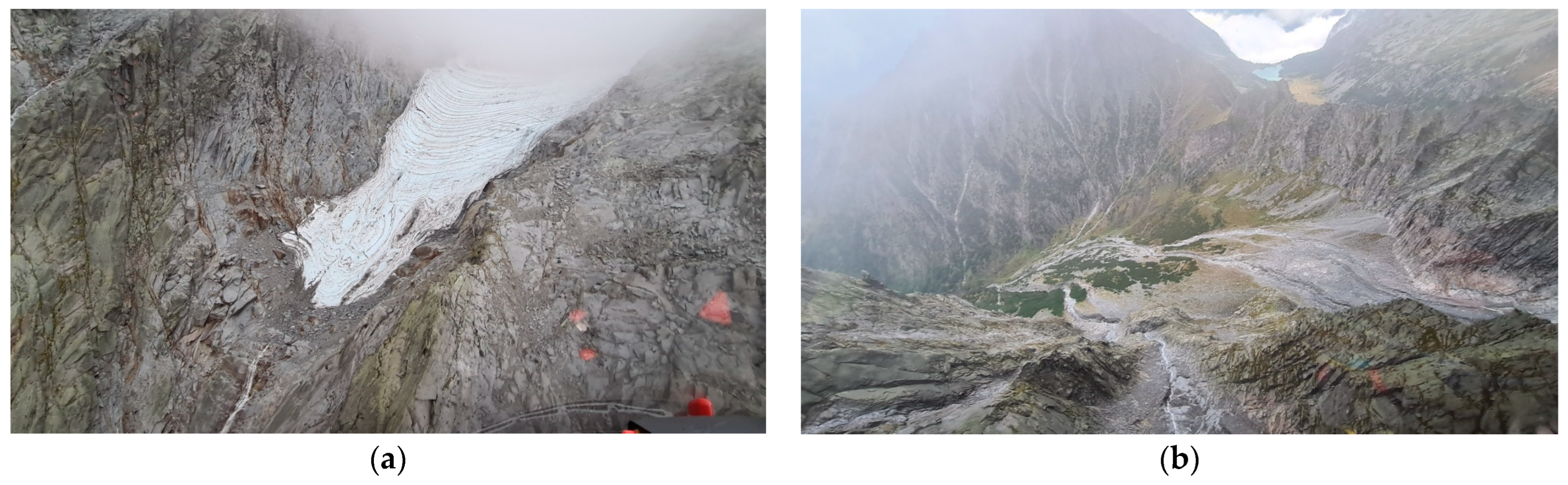 A two-step co-registration procedure enhanced comparability across observation periods. Initial SfM alignment using GCPs was further refined by ICP alignment to the 2021 LiDAR dataset, providing a finer alignment of the previously roughly registered point clouds [91]. Accurate co-registration is essential when comparing datasets of varying quality and origin [95], particularly in complex terrain. The 20-year interval between 1999 and 2021 captured topographic changes related to several debris flow events, including the major 2012 event and the 2006 and 2020 events. Elevation changes in debris flow-prone sectors aligned with event chronology (Table 1), illustrating the utility of C2M analysis for reconstructing sediment transport and deposition. The most reliable reconstruction was in AoI_3, likely due to effective GCP placement, highlighting once again the critical role of high-quality, spatially distributed control. However, numerical values should be interpreted cautiously [96]. Due to inherent uncertainties, results are considered semi-quantitative, serving primarily to support and reinforce the qualitative photointerpretation of geomorphological processes. Referring to Figure 8, cloud-to-mesh distances reveal a consistent erosion–deposition pattern, with negative values in source areas and positive values downslope, reflecting sediment redistribution along the hydrographic network. While this overall trend matches the expected behaviour of debris flows, localised depositional signals are also evident at high elevations. These are related to glacial and periglacial settings, where counter-slopes, glacial cirques, and slope breaks favour sediment accumulation before subsequent remobilisation downslope. Field surveys and helicopter reconnaissance after the 2023 event (Figure 13) documented debris accumulations and depositional features near glacier margins, further supporting this interpretation. Although the 2023 event falls outside the analysis temporal scale, its processes are analogous to past ones, highlighting the acceleration of debris flow activity in the upper catchment. Long-term degradation of glaciated areas has exposed large depositional bodies at high elevations, already evident in headwater incisions. As a result, torrent channels can generate substantial debris flows (e.g., 2023), often initiated from steep sub-vertical rock slopes with poor geomechanical conditions extending across watershed divides. The increasing frequency of such events over the past three decades underlines the geo-hydrological criticality of high-altitude Alpine sectors (see Table 1). Overall, the co-occurrence of erosion and deposition is well captured and consistent with geomorphological interpretation, confirming the potential of multi-temporal photogrammetry for hazard assessment in rapidly evolving Alpine environments [4,97].
