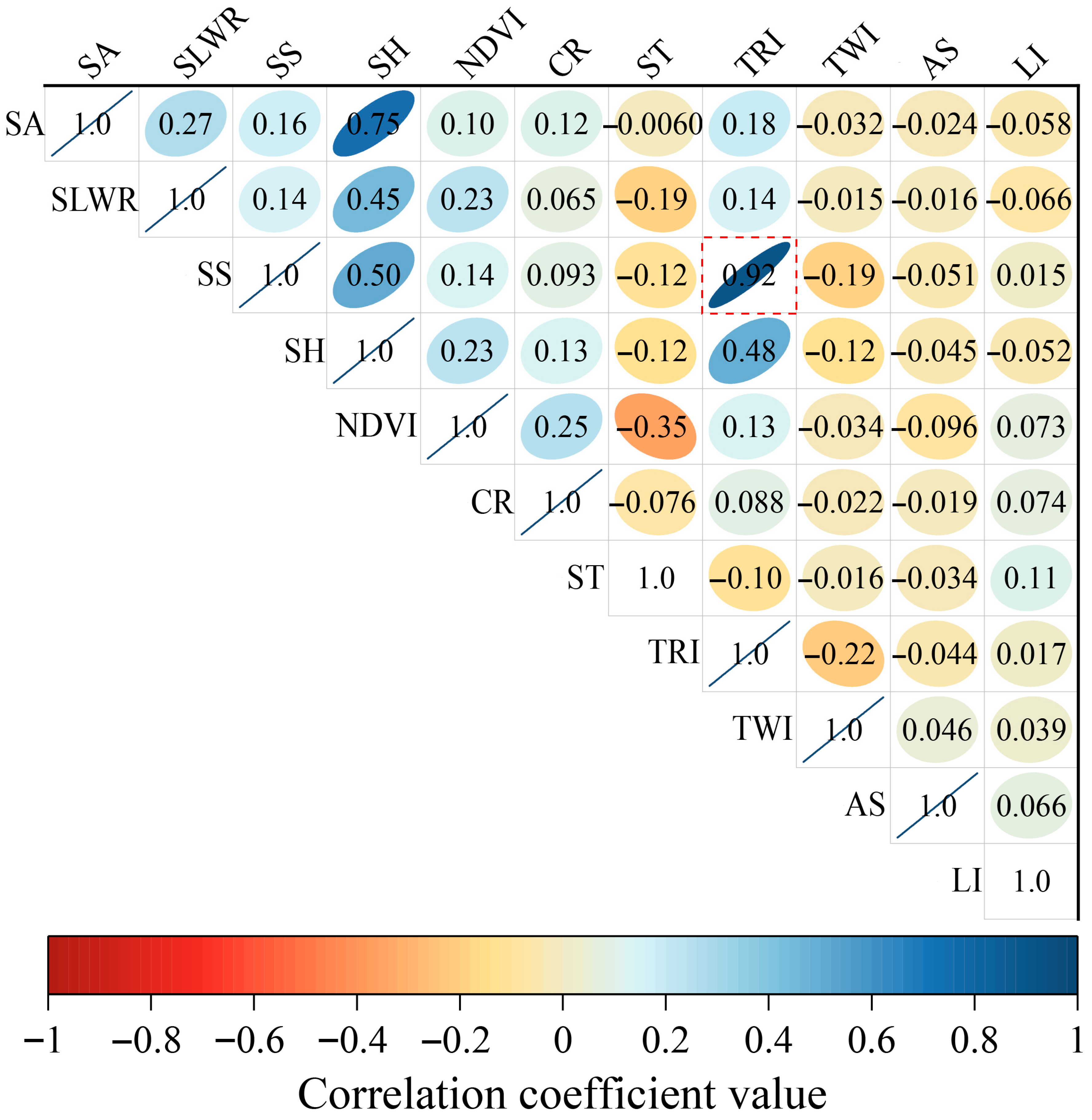 | ST | Soil thickness (cm) | Controls the mass of the sliding body; an optimal thickness range may correspond to a weak interface between residual soil and bedrock. | https://www.geodata.cn/main/face_science_detail?typeName=face_science&guid=72011393607093 (accessed on 3 November 2025) | 2010 | [41] |