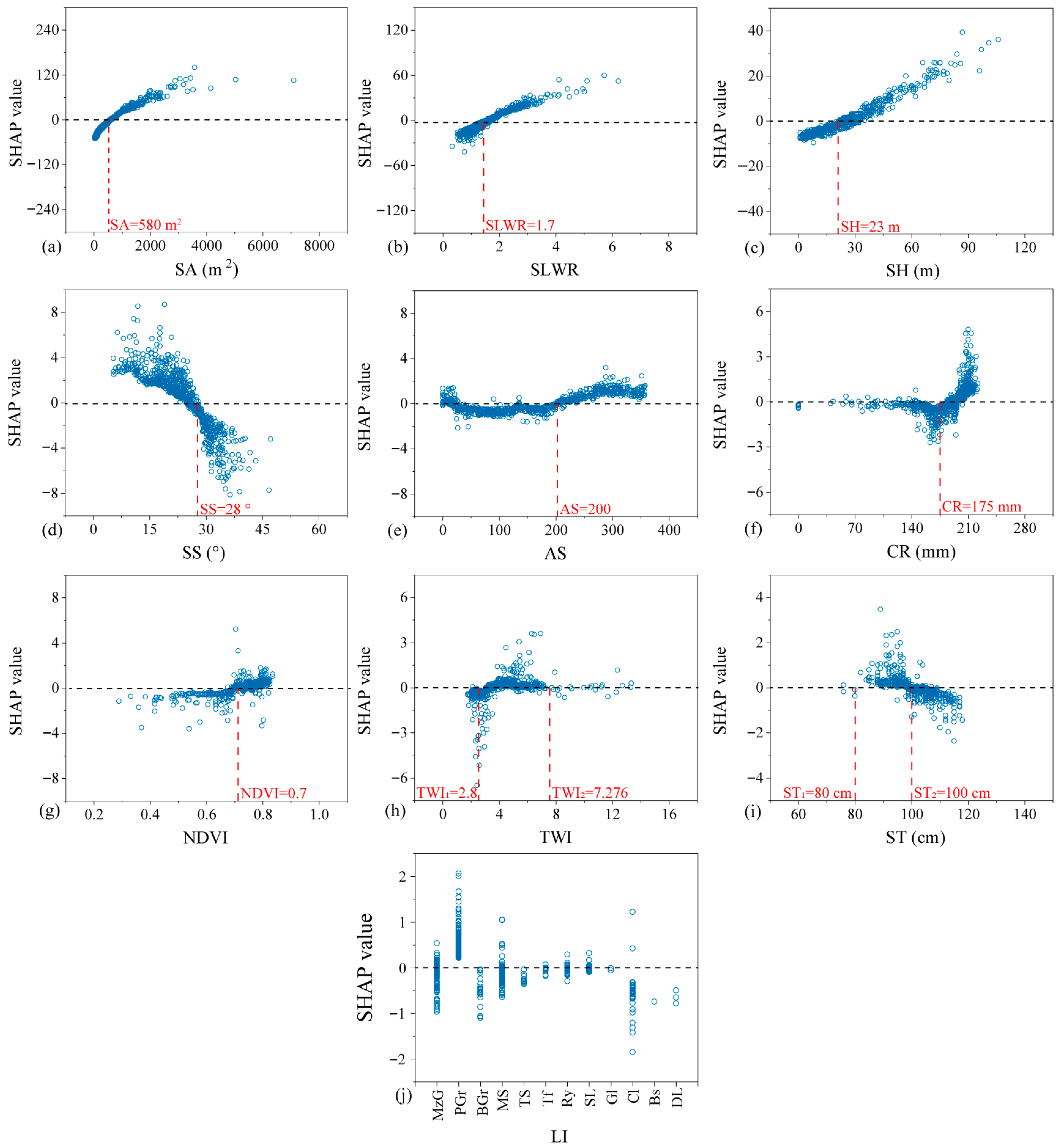 - The SHAP analysis systematically revealed the nonlinear mechanisms and threshold effects of key controlling factors, identifying source area (SA) as the primary factor with a significant scaling effect, followed by the source length/width ratio (SLWR) and source slope (SS).