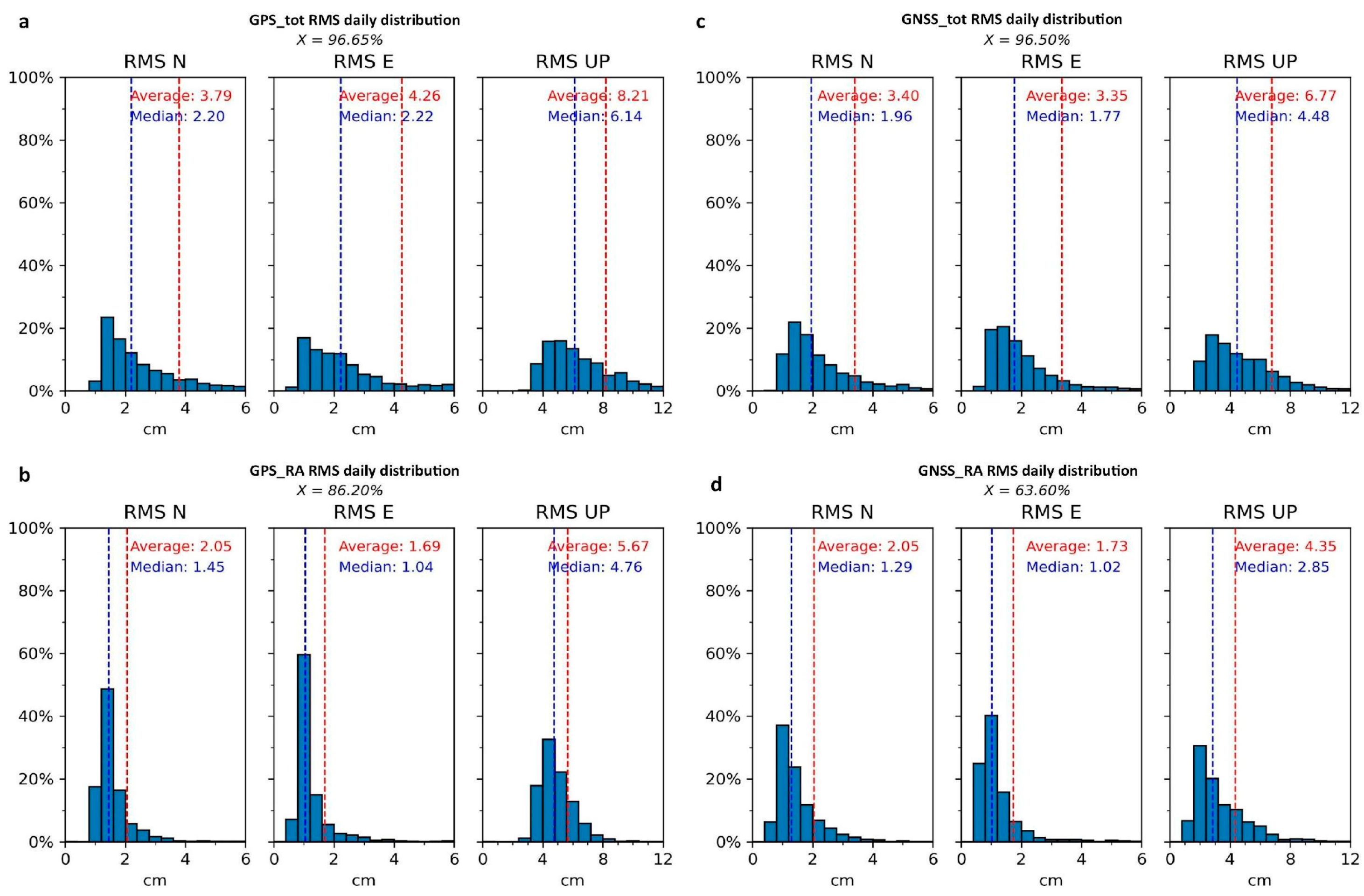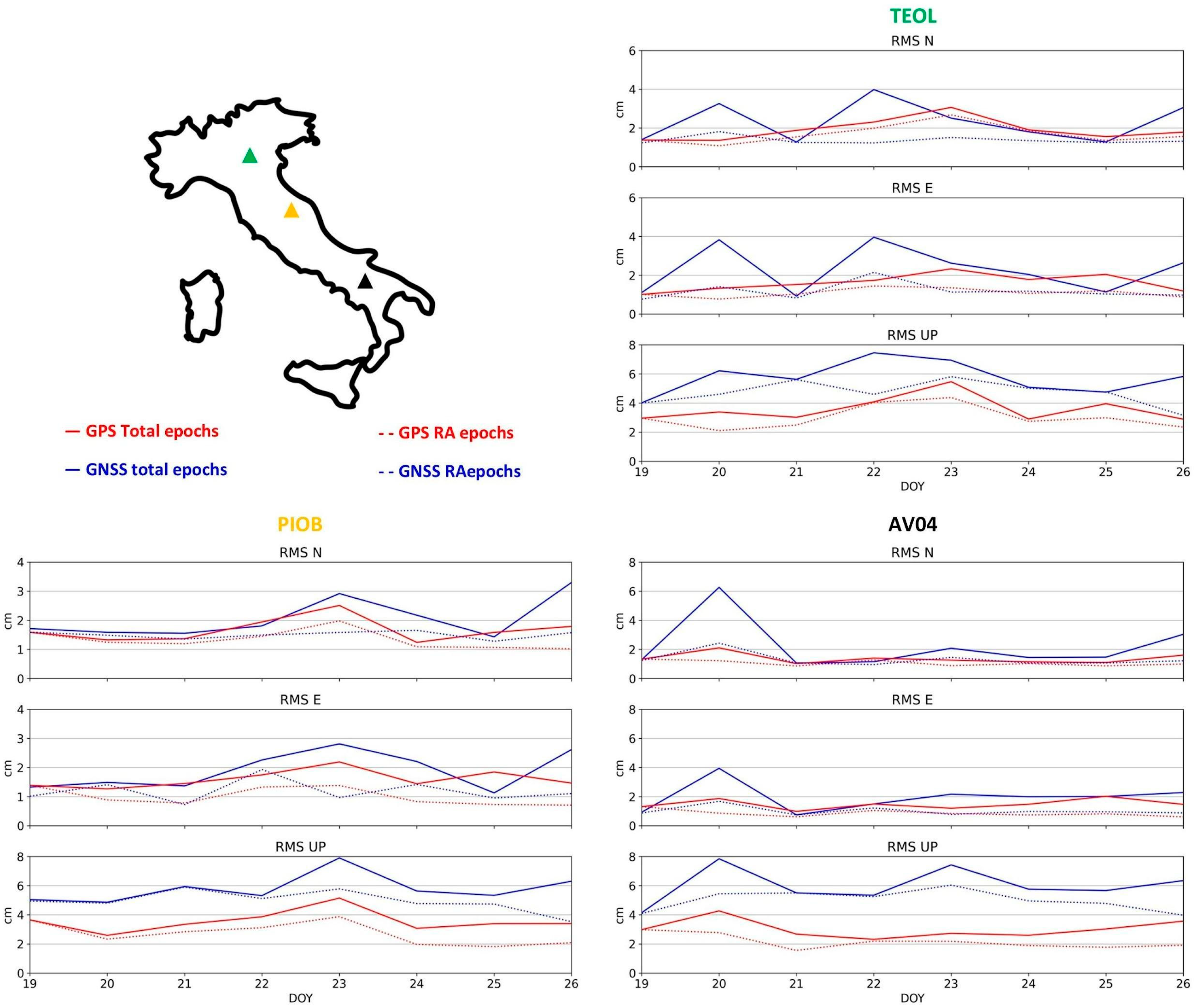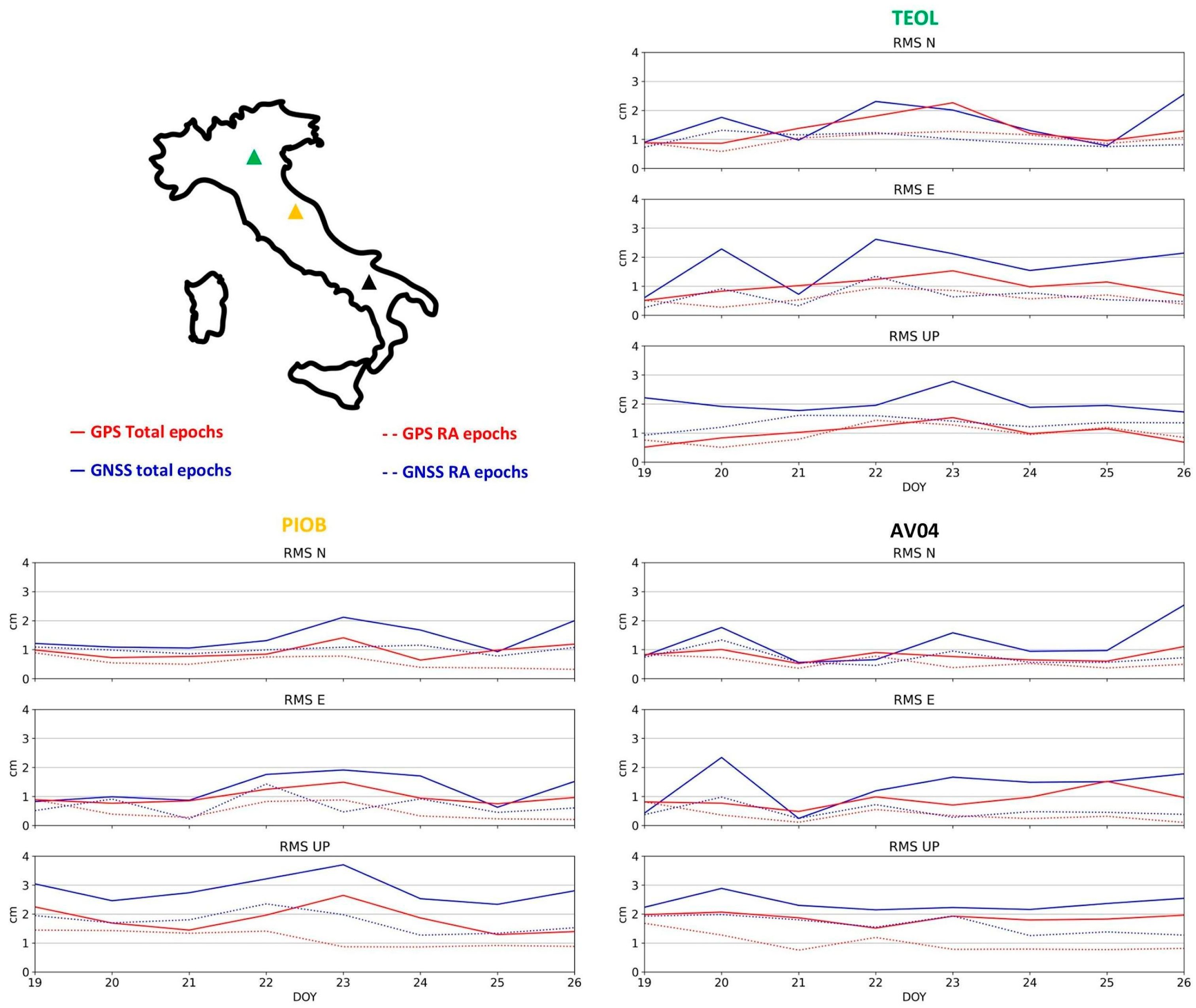 - For the first time an assessment of the accuracies of the RING real-time GNSS position time series is performed, by comparing GPS and GNSS solutions and different Precise Point Positioning (PPP) strategies (standard PPP and PPP with Regional Augmentation PPP-RA)