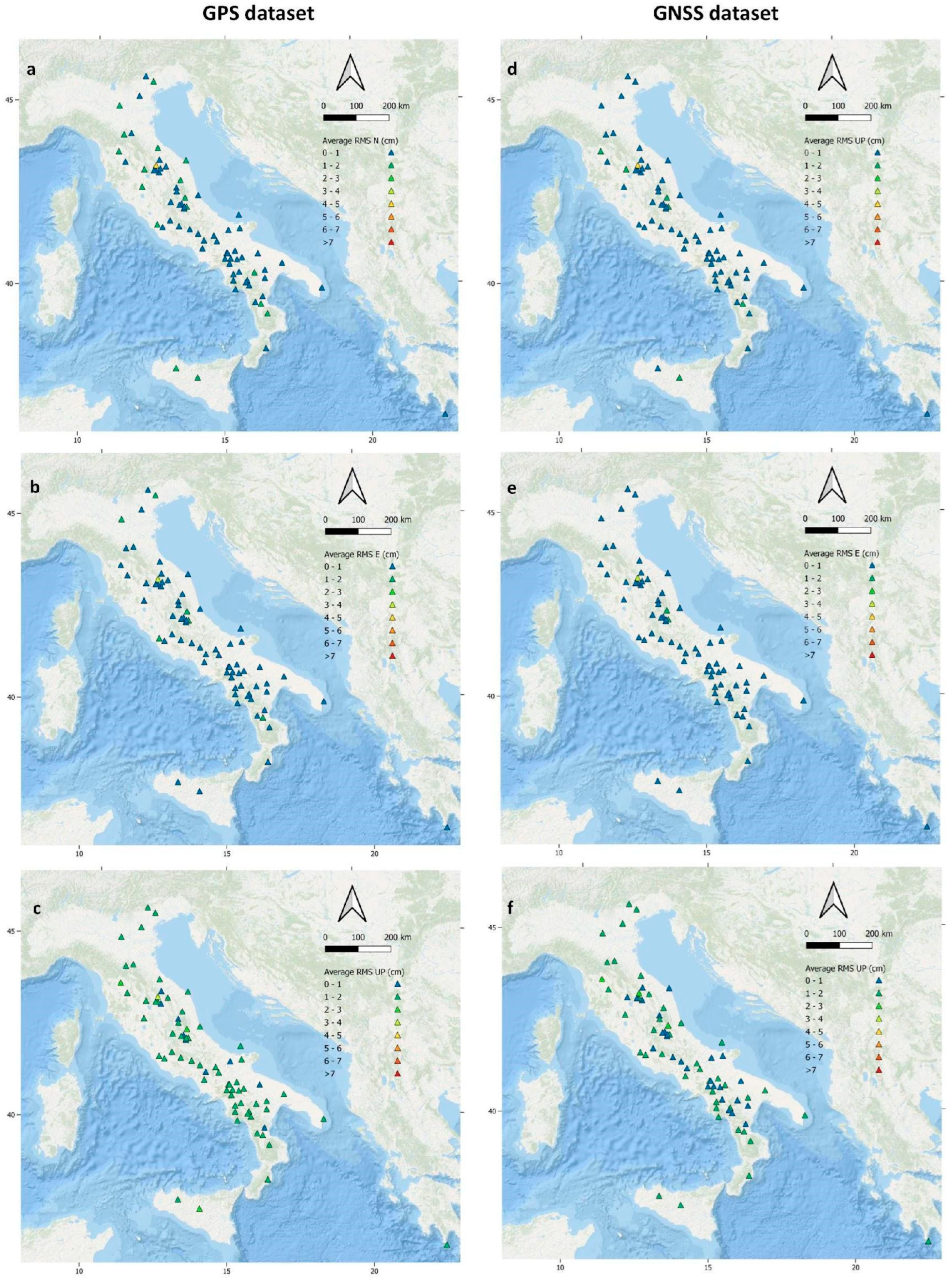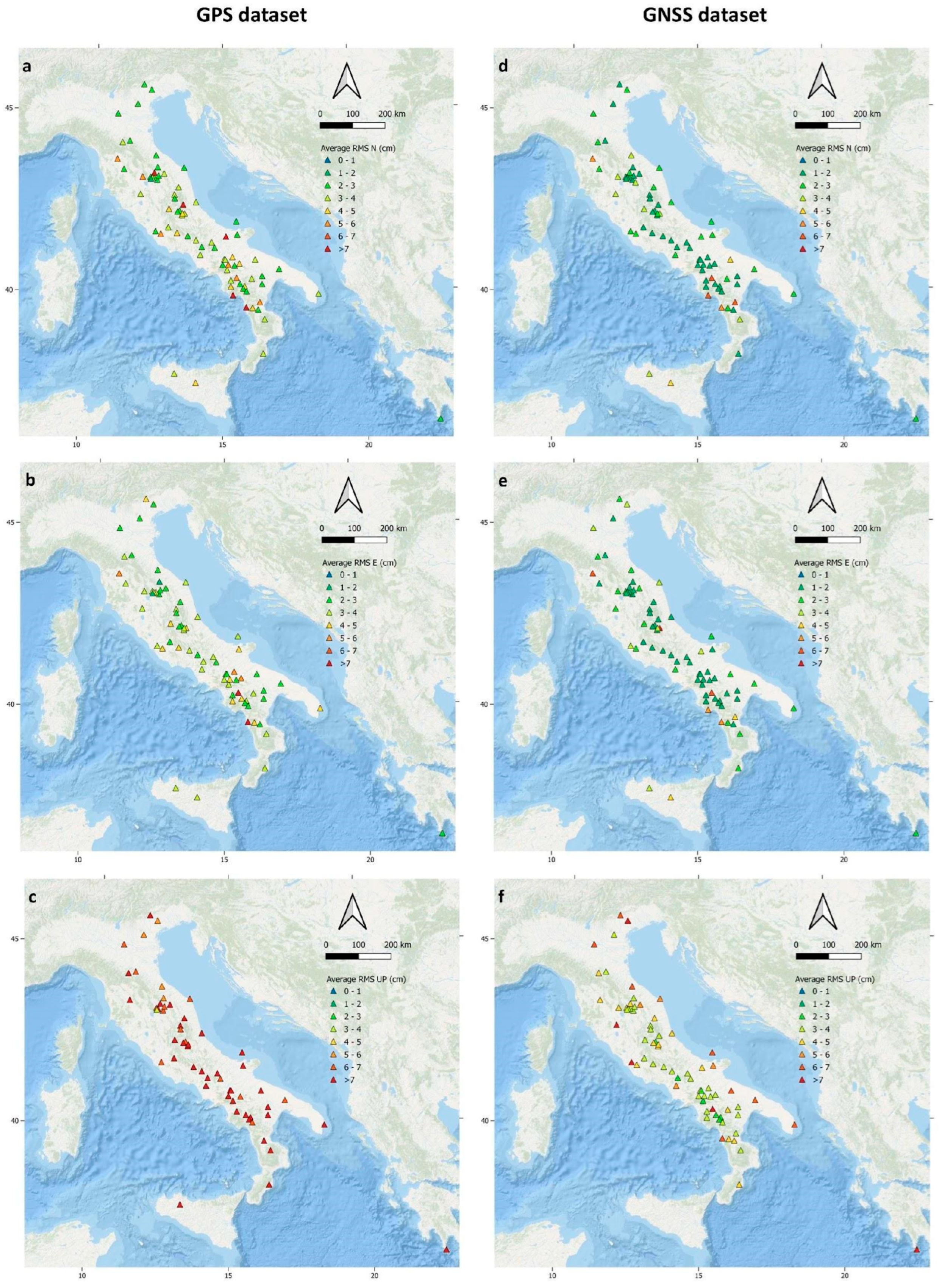 - In the second approach, RMS values were computed for each time series (i.e., each component) using sub-daily overlapping sliding windows. While this method generally yields lower RMS values due to the smaller number of samples, it is particularly useful for detecting sudden transient deformations, such as co-seismic static and dynamic displacements, over shorter time scales. Given the time duration of the co-seismic shaking (30–60 s) during most of the past moderate-magnitude earthquakes in Italy (references), we decided to use 300 s sliding windows with an overlap of 150 s for each step. The 300 s time window is considered enough to sample either the noise or co-seismic dynamic and static displacements for moderate-magnitude earthquakes (M6). The overlaps are used to increase the number of RMS estimations. These RMS values will hereafter be named “sub-daily RMS”.