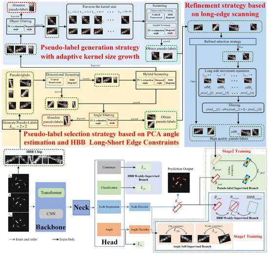 In terms of model architecture and training methods, single-stage detection architectures exhibit higher computational efficiency and a smaller parameter scale than two-stage architectures [23]. Most existing weakly supervised OBB detection methods for optical remote sensing images are based on single-stage architectures and have achieved high detection performance on optical datasets [24,25,26]. These approaches typically employ HBB-based weakly supervised loss to constrain OBB position and scale, along with self-supervised loss derived from image rotation and flipping to learn object angles. Replacing the two-stage architecture in Yue et al.’s method with a single-stage detector, while incorporating angle self-supervision, is expected to improve computational efficiency, reduce model parameters, and enhance OBB angle estimation, thereby leading to better detection performance. Additionally, the difficulty in generating high-quality pseudo-labels for specific targets can lead to increased missed detections under pure pseudo-label supervision. To address this, Yue et al. introduced a coarse-to-fine paradigm in a two-stage framework. Inspired by their work, we adapt this concept into a two-stage training regime for single-stage detectors, beginning with coarse scale and angle learning from HBBs and self-supervision, and culminating in refinement with high-quality pseudo-labels.