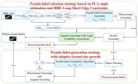 Yue et al. generated OBB pseudo-labels from HBB chips using OTSU [71] and morphological closing, but their strict and singular selection strategy limited the quantity and quality of pseudo-labels. To address these limitations, we propose two strategies: PCA-HBB-PLSS, which selects high-quality pseudo-labels using PCA angle estimation and HBB constraints; and AKG-PLGS, which increases pseudo-label quantity by assigning appropriate kernel sizes for SAR ship targets. As illustrated in Figure 2, HBB chips are processed sequentially through these two modules. The pseudo-label generation algorithm shown in Algorithm 1 takes the HBB chip and kernel size as inputs. It first extracts the hole-free target mask and contour , and then calculates the minimum bounding rectangle to generate pseudo-labels . The following sections first introduce the PCA angle estimation method, which is used in hybrid screening, angular screening with credibility assessment, object filtering, and angular screening. Then, the AKG-PLGS and PCA-HBB-PLSS strategies are detailed.