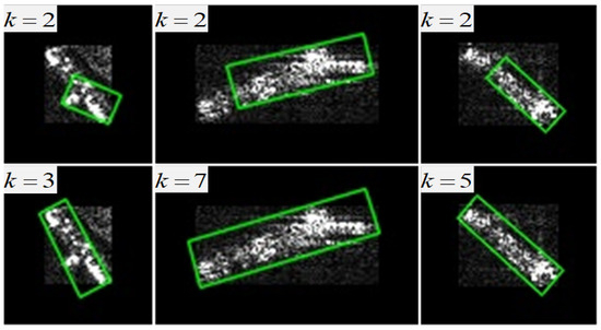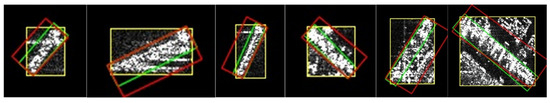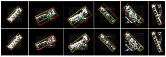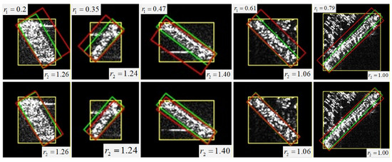 Figure 9 shows the pseudo-label visualization results before and after the LESO. It reveals that pseudo-labels of SAR ship targets affected by defocusing often have one long edge with a small effective length proportion in the HBB chip. When the chip’s aspect ratio is close to 1, some targets still need the LESO to improve pseudo-label quality. Therefore, the RSS calculates the minimum ratio of the segment length of the two long edges within the chip to the long-edge length and compares it with a threshold to determine whether to refine the pseudo-labels. For chips with an aspect ratio close to 1, the threshold for can be increased to optimize selection performance. Specifically, LESO is needed when . When , the threshold for can be relaxed to 0.88 to prevent mis-screening. Otherwise, the LESO is not required.