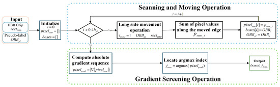 The LESO includes the Scanning and Moving Operation (SMO) and the Gradient Screening Operation (GSO). The SMO iterates the long edge of a pseudo-label within a preset offset distance, generating a candidate box list and a corresponding sequence of edge pixel sums. In the SMO, the Long-Side Movement Operation translates the long edge with the shorter segment length inside the HBB chip along the short-edge direction while keeping the opposite long edge fixed, as illustrated in Figure 7. To optimize the short-edge length, the GSO selects the optimal pseudo-label based on the maximum absolute gradient of the pixel sums covered by the moved edges. Figure 8 illustrates the LESO workflow: the input pseudo-label and HBB chip are processed by the SMO to produce a candidate pseudo-label list and a pixel sum sequence , where denotes the pseudo-label’s short-edge length. The GSO then identifies the refined pseudo-label using the maximum gradient index . The calculation of is as follows: