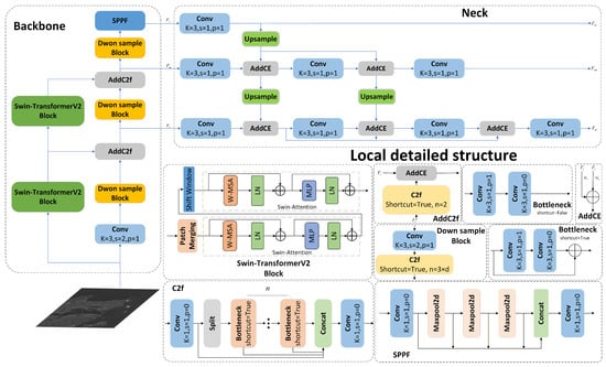 To enhance detection performance and computational efficiency, we improved the backbone and neck structures of Yue et al.’s method. We integrated Swin-TransformerV2 with a few convolutional layers in a parallel structure, reducing the model’s parameter scale and improving its computational efficiency and global information acquisition capability. We also used a top-down adaptive feature fusion method to enhance the semantic information of high-resolution features, improving the neck structure’s feature fusion capability and boosting detection performance. The backbone and neck structures of our method are illustrated in Figure 10.