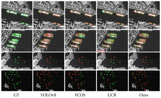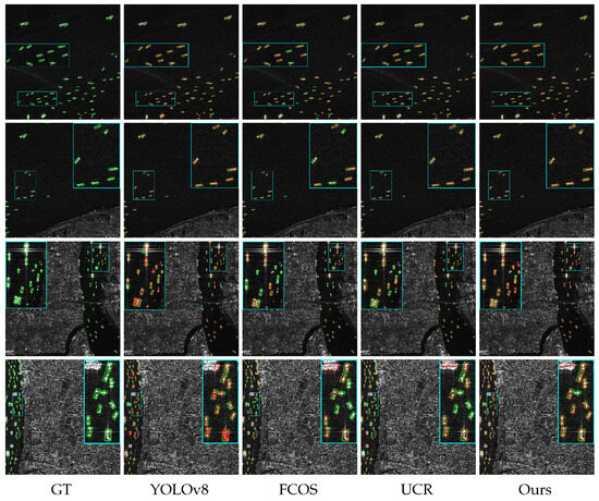 In Table 5, Experiments 5, 6, 7, and 8 demonstrate that the backbone structure, neck structure, and two-stage training method in our approach effectively enhance the detection performance of UCR. Among these, the SwinV2-CNN backbone structure contributes the most to performance improvement while also significantly reducing the model’s parameter scale and computational cost. Experiments 2–4 and 8 reveal that the proposed backbone and neck structures alone, under angle self-supervision and horizontal box weak supervision, fail to reach their full potential. However, when either of these structures is combined with the two-stage training method, a substantial boost in detection performance is observed. This highlights the effectiveness of the two-stage training method in leveraging high-quality pseudo-labels to fully realize the detection capabilities of our backbone and neck structures. Experiments 1–3 demonstrate that the integration of the two-stage training method with the enhanced backbone and neck architectures achieves the strongest detection performance across the entire HRSID test set, with an mAP50 of 82.50%. Comparisons between Experiments 1 and 3 reveal that the UCR structure enhances detection performance but increases the model’s parameter scale and computational load. Meanwhile, Experiments 1 and 2 show that the SwinV2-CNN backbone structure not only boosts performance but also reduces the model’s parameter count and computational cost.