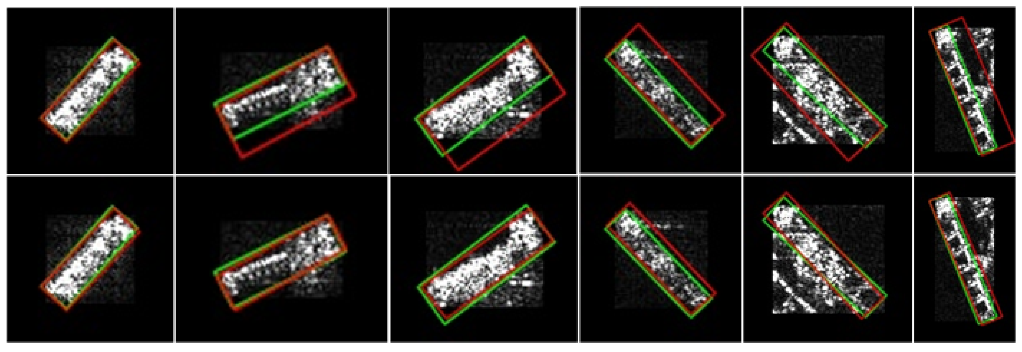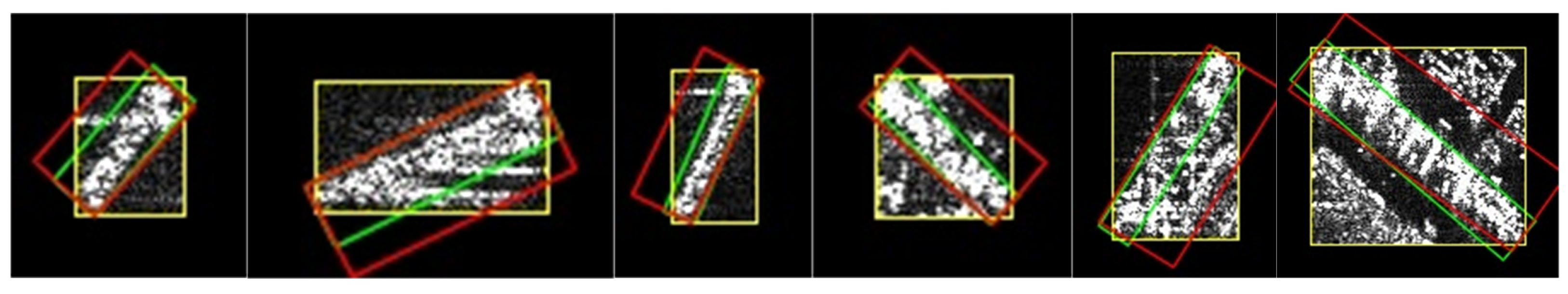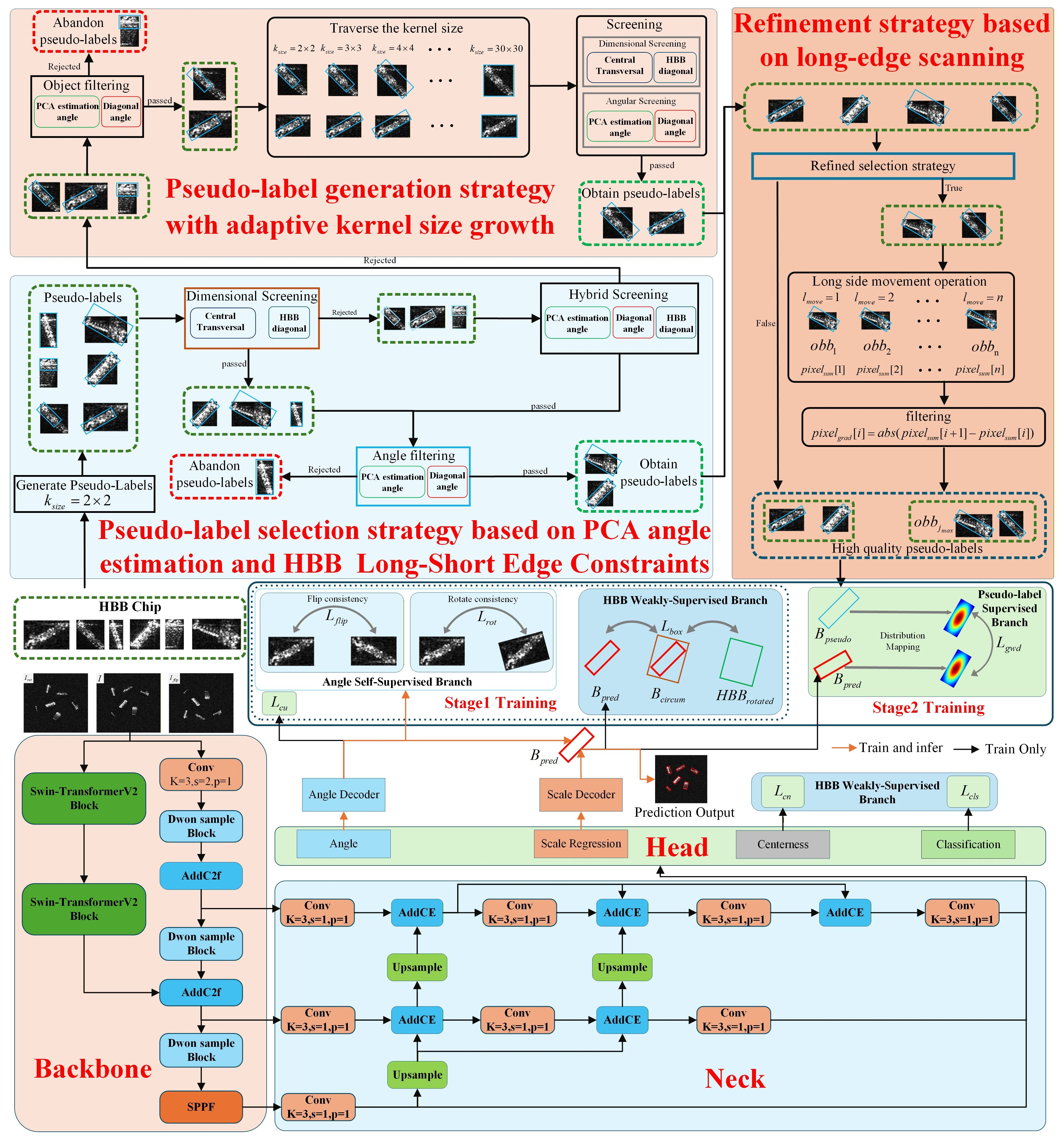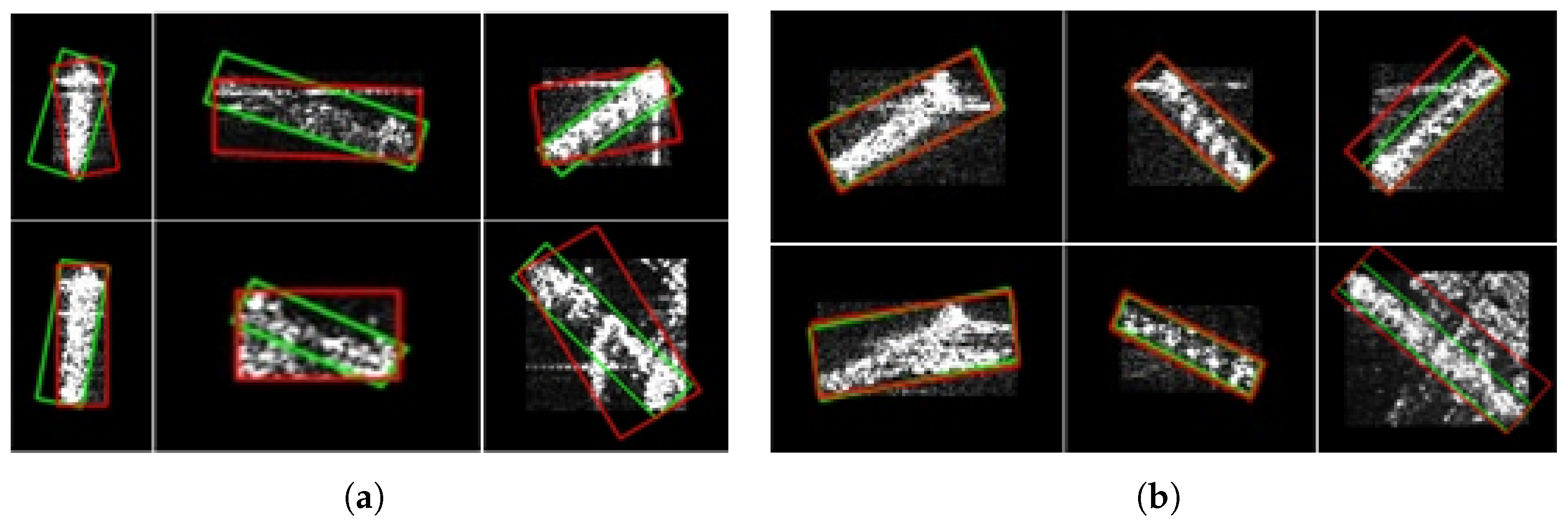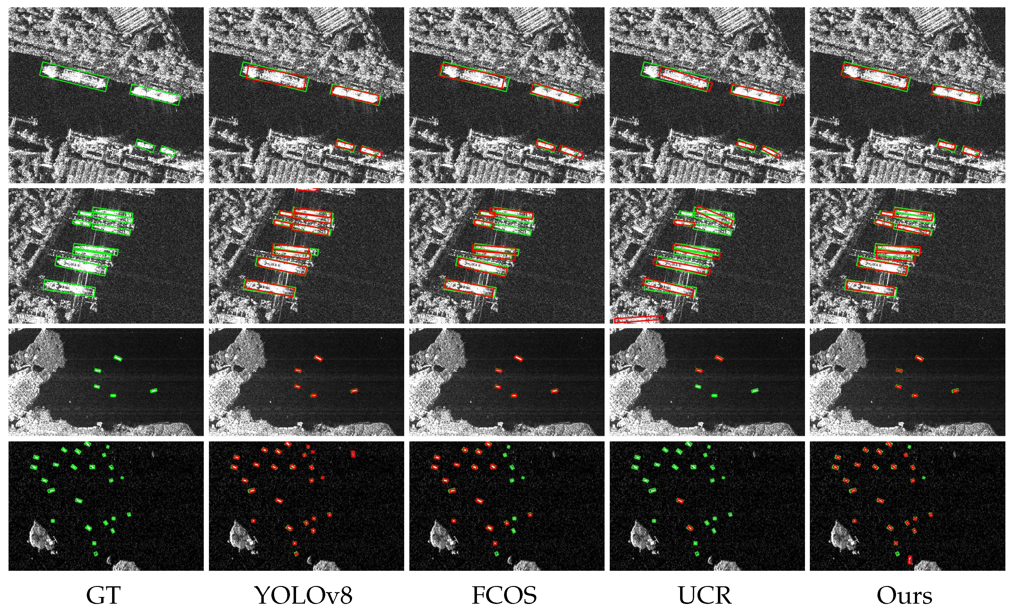 Table 1. This discrepancy is primarily attributed to the limited scale of the SSDD dataset. Our approach integrates self-supervised learning via random rotation and flipping, weakly supervised learning based on HBBs, and pseudo-label-guided learning for angle and scale estimation. The constrained dataset size restricts the acquisition of sufficient multi-angle samples and high-quality pseudo-labels, thereby impairing the model’s capacity to learn discriminative orientation and scale features. Furthermore, the inherent orientation sensitivity of SAR targets diminishes the efficacy of self-supervised augmentation. The limited training samples also increase overfitting risks, while the small test set may fail to reveal such overfitting, contributing to the apparently superior performance of fully supervised models in evaluation metrics.