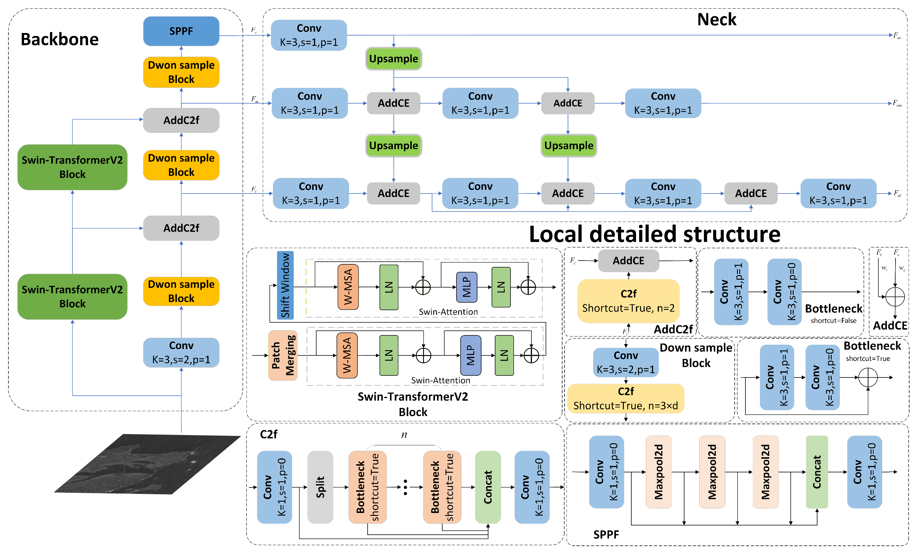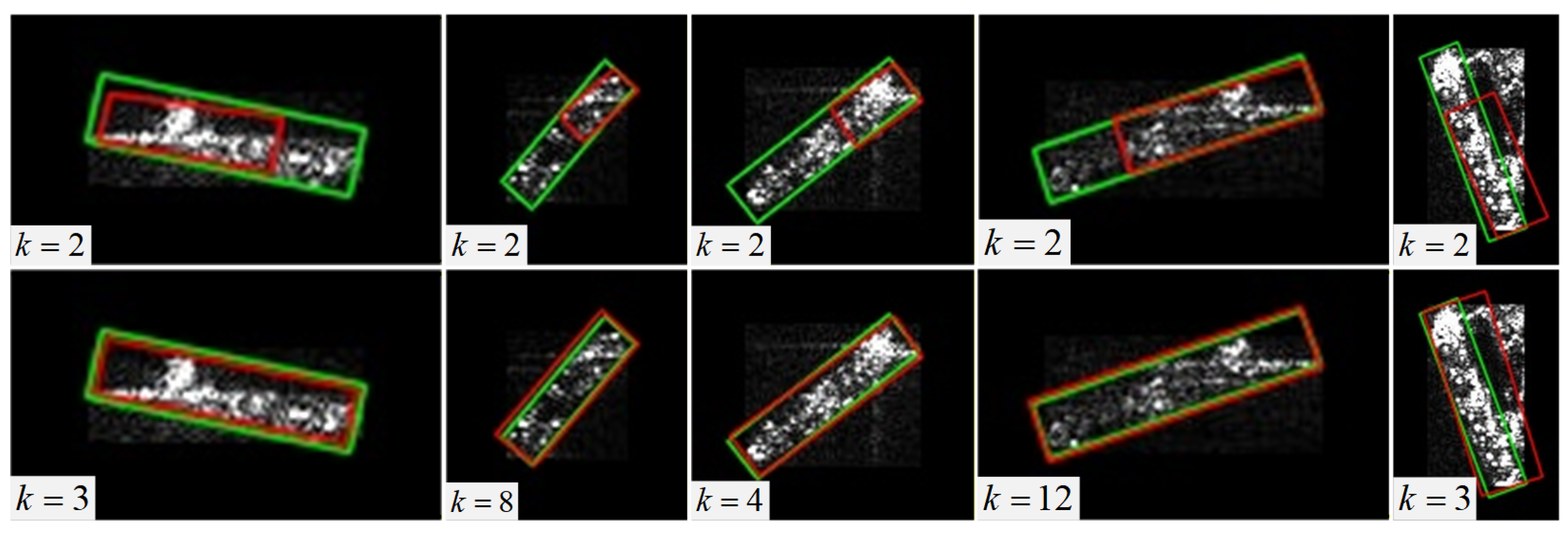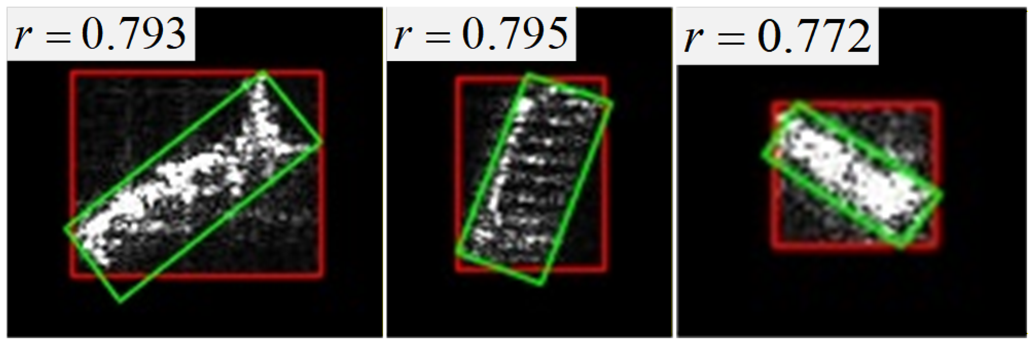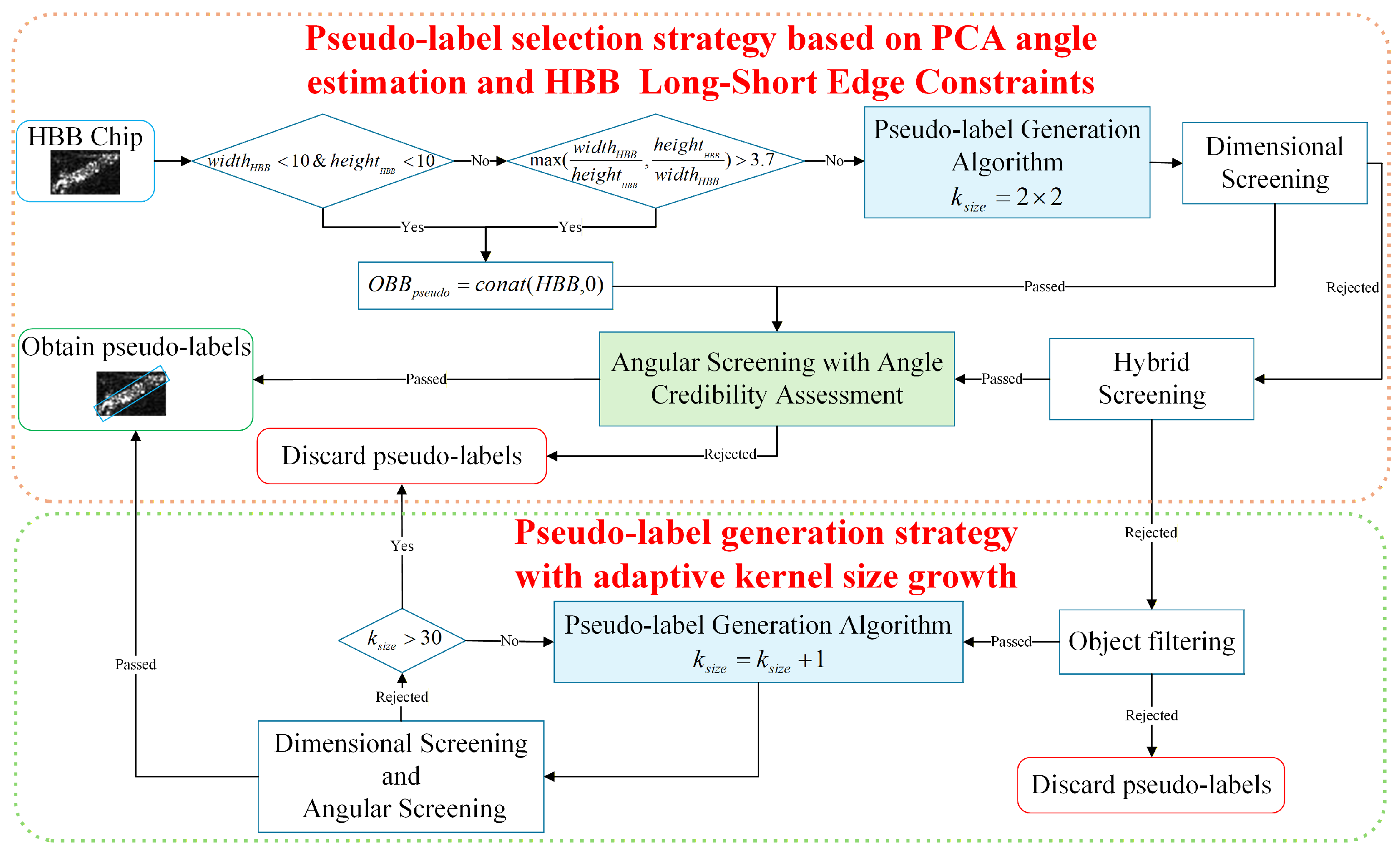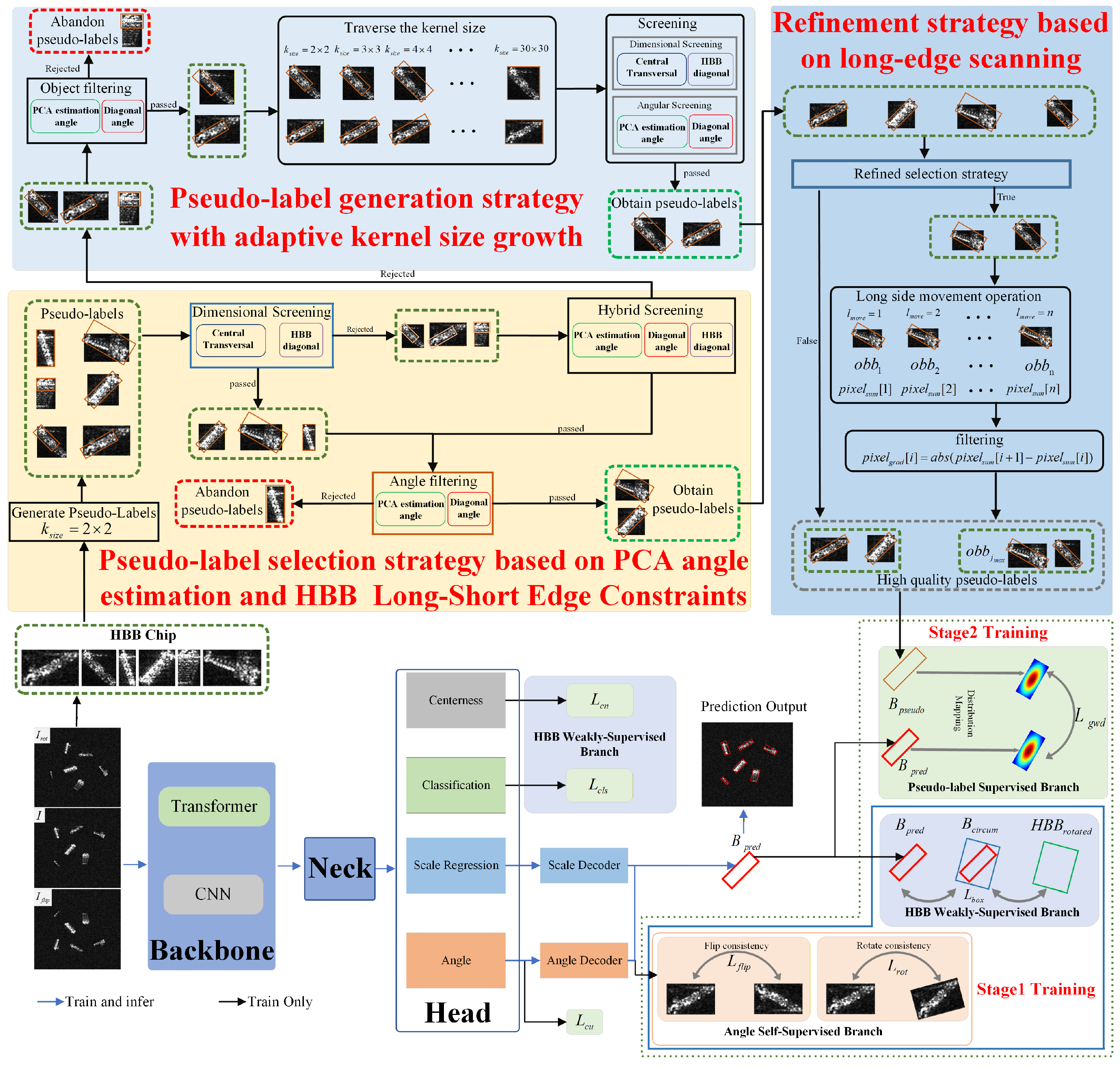 Table 1. This discrepancy is primarily attributed to the limited scale of the SSDD dataset. Our approach integrates self-supervised learning via random rotation and flipping, weakly supervised learning based on HBBs, and pseudo-label-guided learning for angle and scale estimation. The constrained dataset size restricts the acquisition of sufficient multi-angle samples and high-quality pseudo-labels, thereby impairing the model’s capacity to learn discriminative orientation and scale features. Furthermore, the inherent orientation sensitivity of SAR targets diminishes the efficacy of self-supervised augmentation. The limited training samples also increase overfitting risks, while the small test set may fail to reveal such overfitting, contributing to the apparently superior performance of fully supervised models in evaluation metrics.