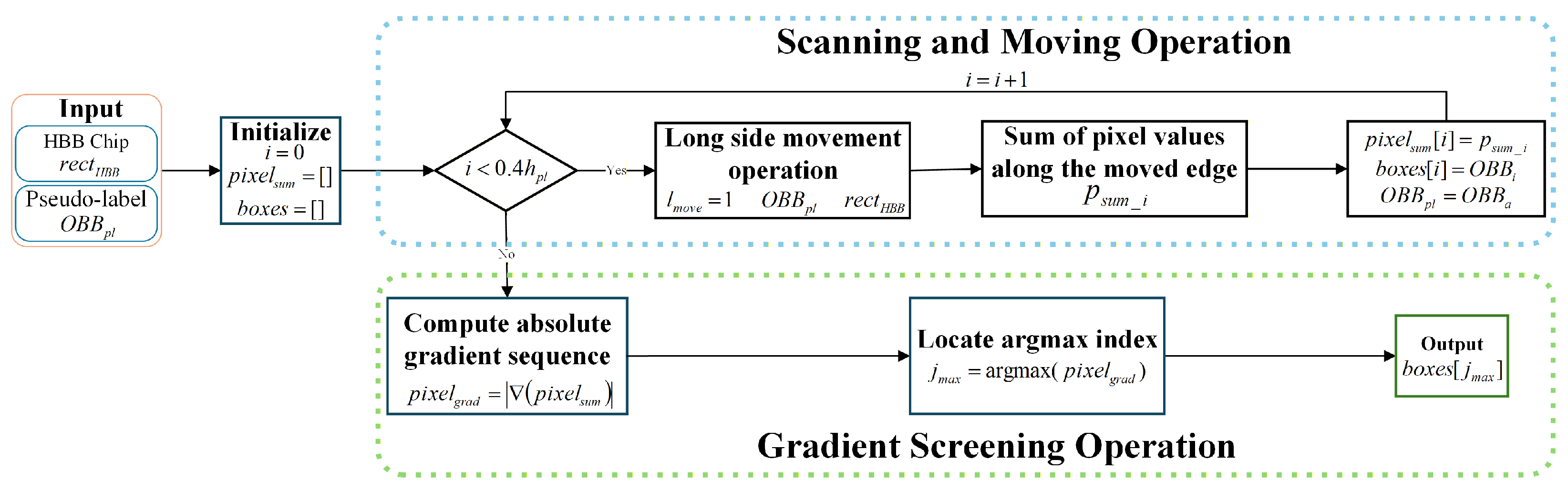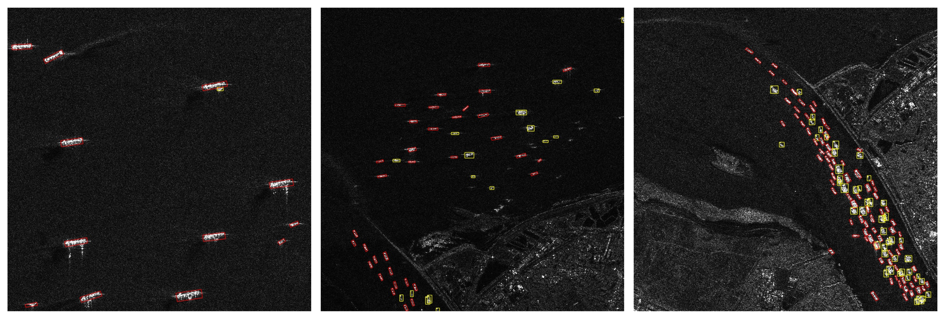 Our method aims to train the OBB detector using HBB labels to enhance detection performance and inference efficiency. To validate the effectiveness of our method, the experimental datasets need to contain both OBB and HBB annotations. Accordingly, we select the HRSID and SSDD datasets for our experiments. Both HRSID and SSDD are high-resolution SAR image datasets specifically designed for ship detection, semantic segmentation, and instance segmentation tasks. The HRSID dataset comprises 5604 images of size 800 × 800, with 16,951 ship instances annotated, covering various resolutions, polarization modes, sea conditions, and maritime scenes. The SSDD dataset contains 1160 images with pixel lengths ranging from 500 to 600, annotating 2456 ship targets, encompassing diverse sea conditions, ship types, and sizes. In our experiments, the HRSID dataset is split into a 65% training set and a 35% testing set, while the SSDD dataset follows a 7:3 split ratio. Throughout the experiments, the input image size is uniformly set to 800 × 800. The partitioning of the training and testing sets strictly follows the protocols established in the mainstream literature, ensuring that the reported detection metrics can be compared in a direct and quantitative manner.