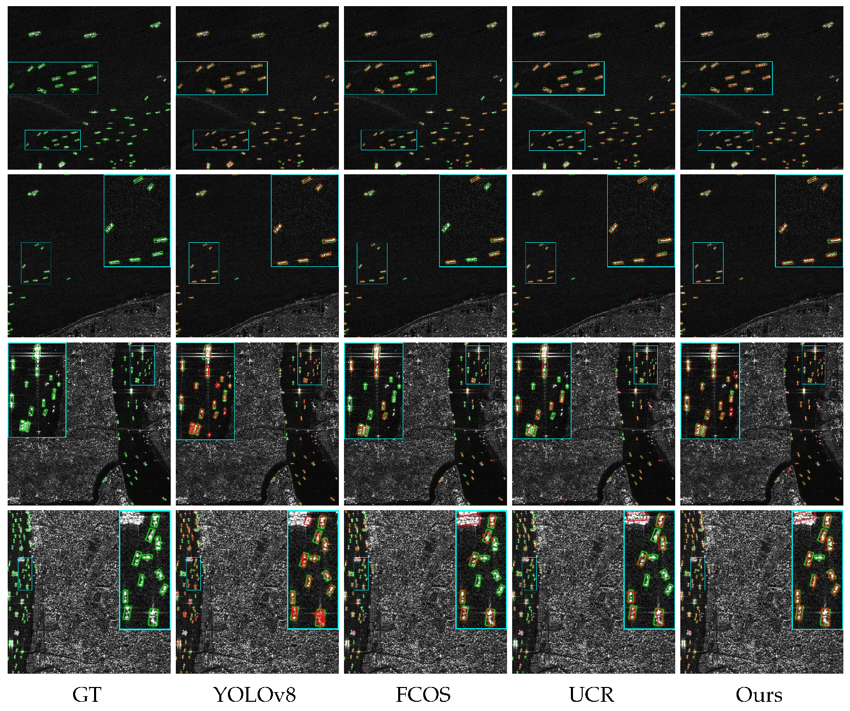 Figure 12, rows 2 and 4 indicate that our method performs only slightly worse than fully supervised YOLOv8 in detecting dense large targets inshore and very small dense targets offshore. Rows 1 and 3 further show that our precision for inshore targets of varying sizes is comparable to YOLOv8 and superior to the other methods. These results confirm that our approach attains detection performance competitive with fully supervised methods.