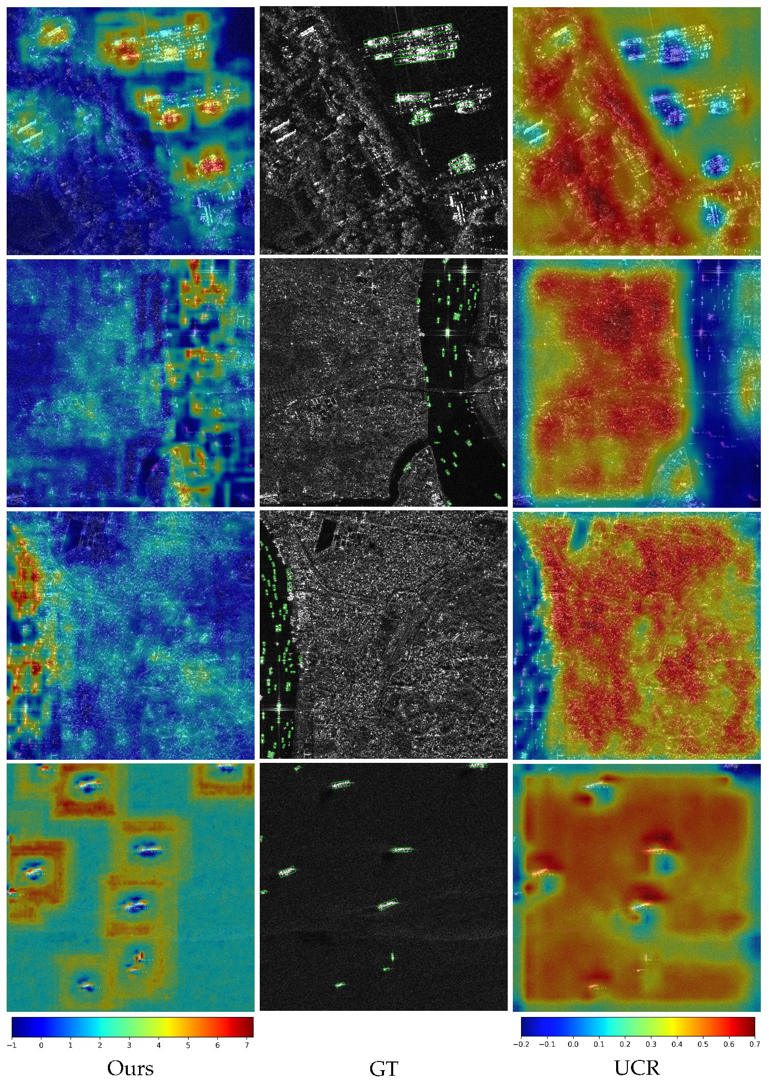 Figure 12 present the detection results of four different methods on the various scenarios of the HRSID and SSDD. FCOS and YOLOv8, as strong fully supervised detectors, provide the structural basis for our approach, with our backbone design inspired by YOLOv8. UCR, a weakly supervised approach, shares the first-stage training loss with our method and thus serves as our direct baseline. As shown in