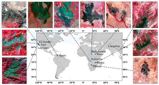 Distribution of the sample sites in the burned vegetation dataset. Ten study area images showing bands 5, 4, and 3 false color combinations from Landsat 8: (a) Los Gatos, (b) EI Dorado, (c) Inyo, (d) Apure, (e) Kahemba, (f) Barh Azoum, (g) Kusti, (h) Liangshan, (i) Mpika, and (j) Dirico.