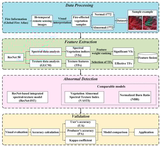 In this study, we specifically propose the ResNet-IST model, which is a deep ResNet50-based, combined spectral and textural feature method for detecting anomalous burned vegetation areas. Our primary objectives are to (1) develop a DL framework based on ResNet50 (ResNet-IST) to extract spectral and spatial information from satellite images of normal and abnormal vegetation samples and perform feature fusion. This model is then employed to detect and classify abnormal vegetation areas affected by wildfires. (2) The performance of the ResNet-IST framework is evaluated on the basis of abnormal detection results across study areas from ten sites worldwide, and its performance is compared with that of other burned area detection indices, the VASTI and NBR.
